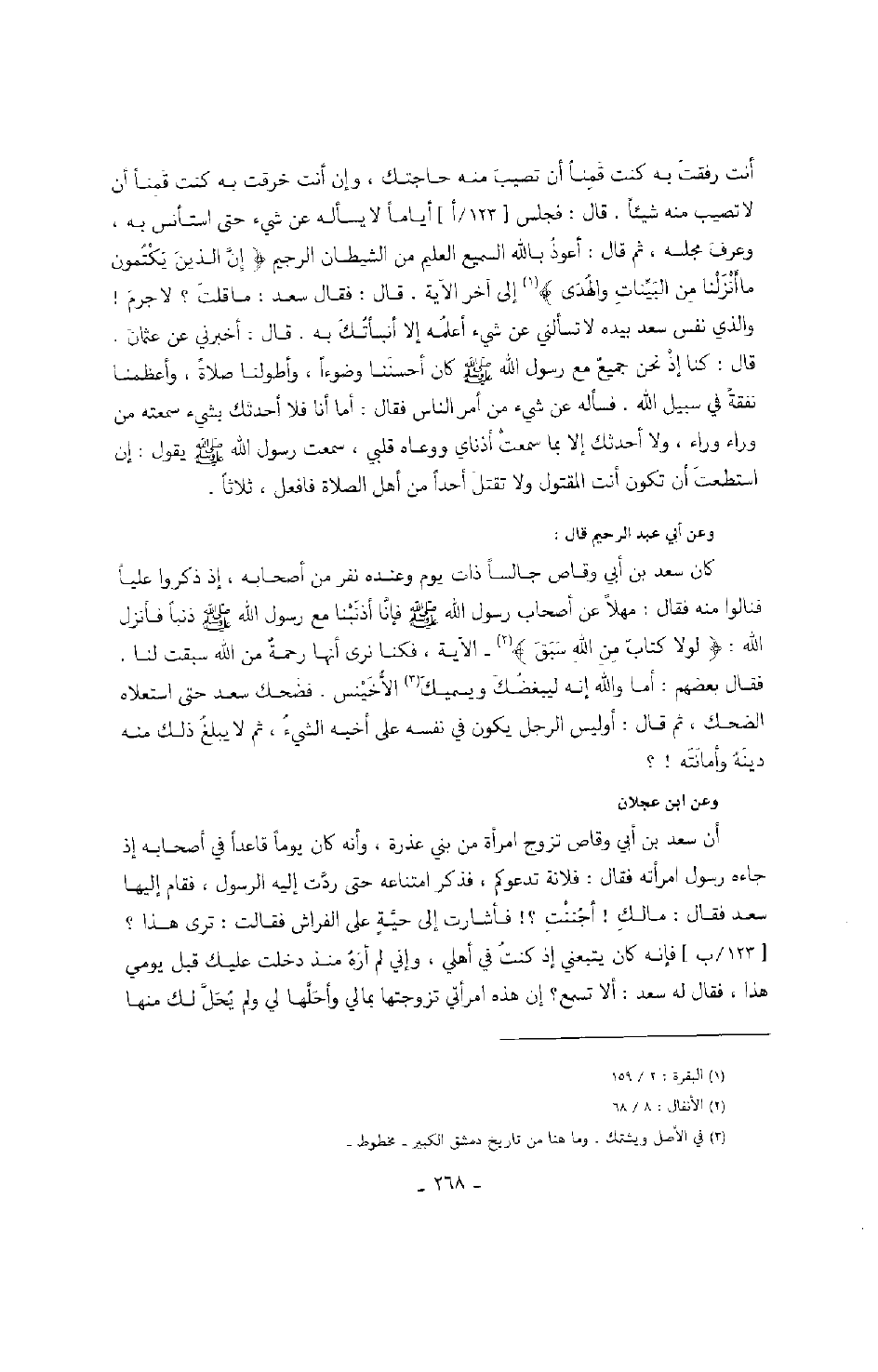 أنت رفقت به كنت قمناً أن تصيب منه حاجتك، وإن أنت خرقت به كنت قمناً أن لا تصيب منه شيئاً. قال: فجلس أياماً لا يسأله عن شيء حتى استأنس به، وعرف مجلسه، ثم قال: أعوذ بالله السميع العليم من الشيطان الرجيم: " إن الذين يكتمون ما أنزلنا من البينات والهدى ". إلى آخر الآية. قال: فقال سعد: ما قلت؟ لا جرم! والذي نفس سعد بيده لا تسألني عن شيء أعلمه إلا أنبأتك به. قال: أخبرني عن عثمان. قال: كنا إذ نحن جميعٌ مع رسول الله صَلَّى اللهُ عَلَيْهِ وَسَلَّمَ كان أحسننا وضوءاً، وأطولنا صلاةً، وأعظمنا نفقةً في سبيل الله. فسأله عن شيء من أمر الناس فقال: أما أنا فلا أحدثك بشيء سمعته من وراء وراء، ولا أحدثك إلا بما سمعت أذناي ووعاه قلبي، سمعت رسول الله صَلَّى اللهُ عَلَيْهِ وَسَلَّمَ يقول: إن استطعت أن تكون أنت المقتول ولا تقتل أحداً من أهل الصلاة فافعل، ثلاثاً.
