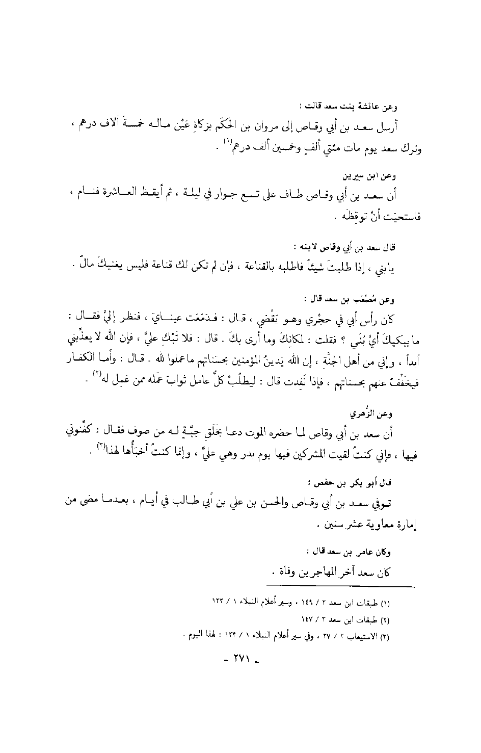 وعن مصعب بن سعد قال: كان رأس أبي في حجري وهو يقضي، قال: فدمعت عيناي، فنظر إلي فقال: ما يبكي أي بني؟ فقلت: لمكانك وما أرى بك. قال: فلا تبك علي، فإن الله لا يعذبني أبداً. وإني من أهل الجنة، إن الله يدين المؤمنين بحسناتهم ما عملوا لله. قال: وأما الكفار فيخفف عنهم بحسناتهم، فإذا نفدت قال: ليطلب كل عامل ثواب عمله ممن عمل له.