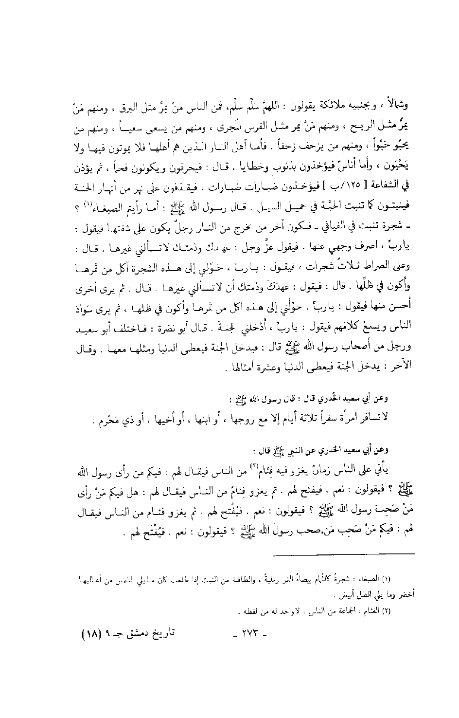 وعن أبي سعيد الخدري عن النبي صَلَّى اللهُ عَلَيْهِ وَسَلَّمَ قال: يأتي على الناس زمانٌ يغزو فيه فئام من الناس فيقال لهم: فيكم من رأى رسول الله صَلَّى اللهُ عَلَيْهِ وَسَلَّمَ؟ فيقولون: نعم. فيفتح لهم. ثم يغزو فئامٌ من الناس فيقال لهم: هل فيكم من رأى من صحب رسول الله صَلَّى اللهُ عَلَيْهِ وَسَلَّمَ؟ فيقولون: نعم. فيفتح لهم، ثم يغزو فئام من الناس فيقال لهم: فيكم من صحب من صحب رسول الله صَلَّى اللهُ عَلَيْهِ وَسَلَّمَ؟ فيقولون: نعم. فيفتح لهم.