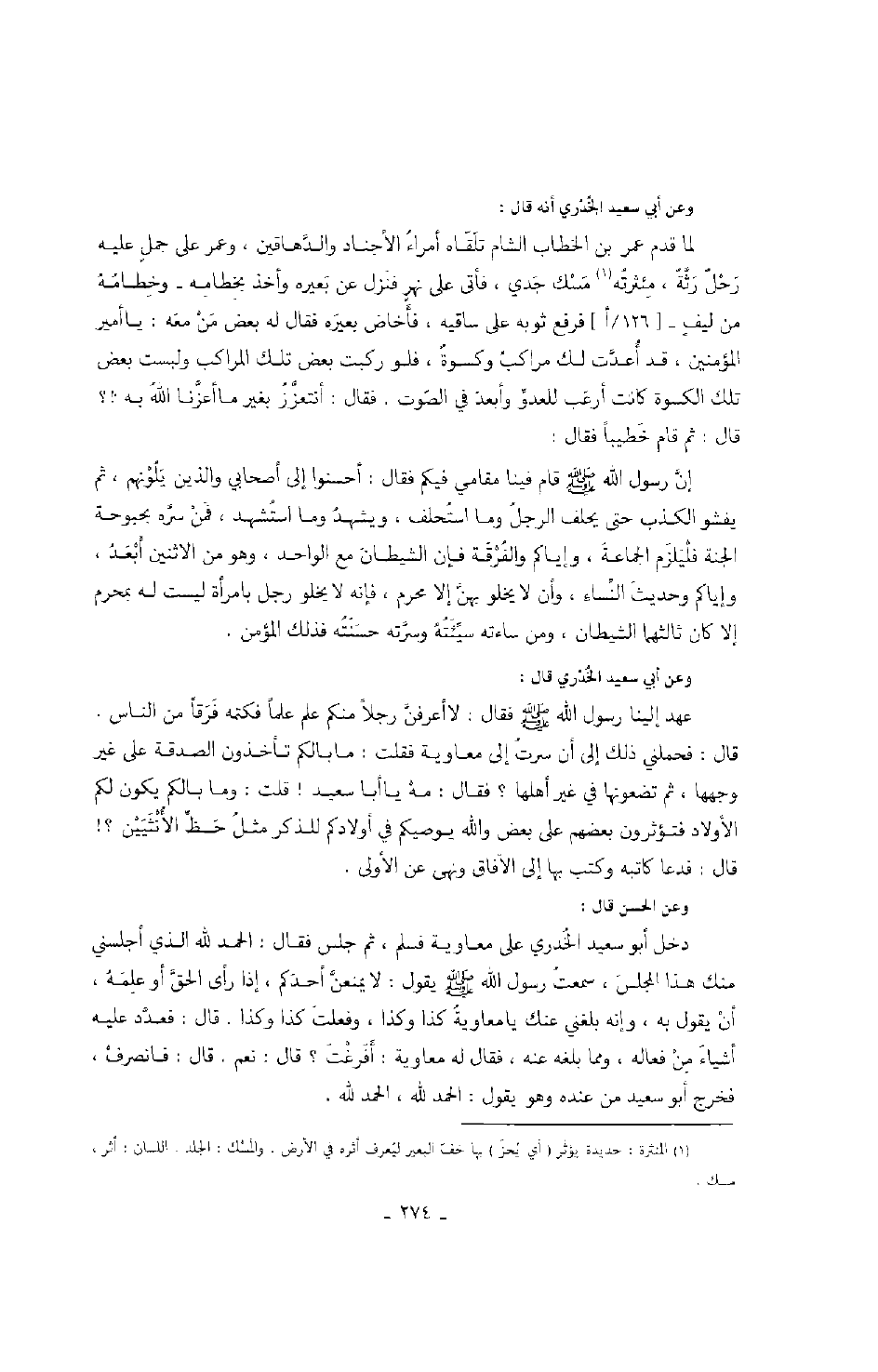 وعن أبي سعيد الخدري قال: عهد إلينا رسول الله صَلَّى اللهُ عَلَيْهِ وَسَلَّمَ فقال: " لا أعرفن رجلاً منكم علم علماً فكتمه فرقاً من الناس " قال: فحملني ذلك إلى أن سرت إلى معاوية فقلت: ما بالكم تأخذون الصدقة على غير وجهها، ثم تضعونها في غير أهلها؟ فقال: مه يا أبا سعيد! قلت: وما بالكم يكون لكم الأولاد فتؤثرون بعضهم على بعض والله يوصيكم في أولادكم للذكر مثل حظ الأنثيين!؟ قال: فدعا كاتبه وكتب بها إلى الآفاق ونهى عن الأولى.