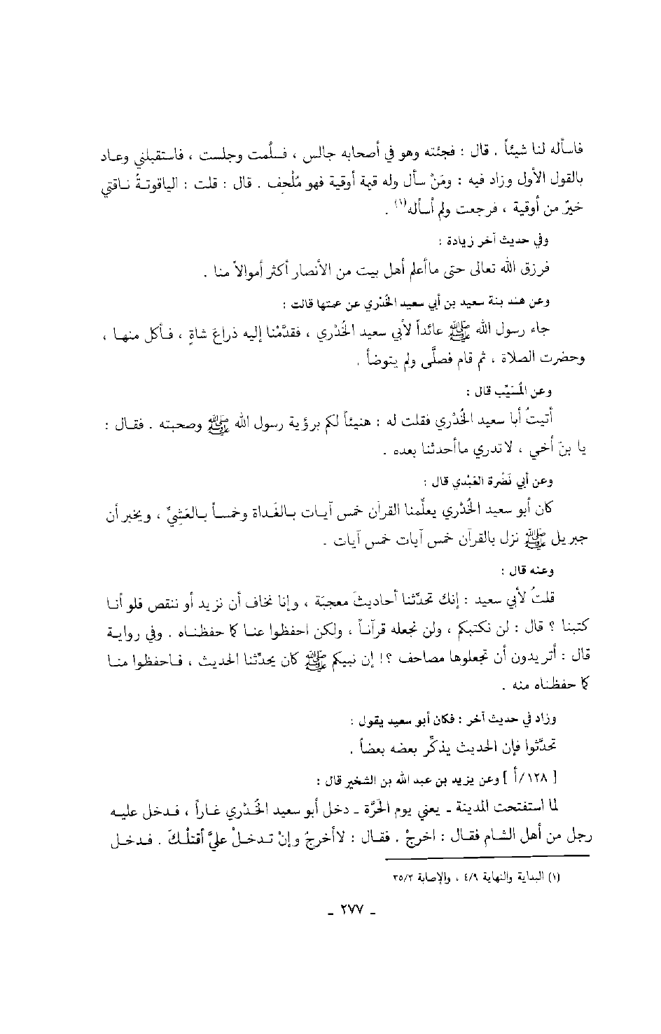 وعنه قال: قلت لأبي سعيد: إنك تحدثنا أحاديث معجبة، وإنا نخاف أن نزيد أو ننقص فلو أنا كتبنا؟ قال: لن نكتبكم، ولن نجعله قرآناً، ولكن احفظوا عنا كما حفظناه. وفي رواية قال: أتريدون أن تجعلوها مصاحف!؟ إن نبيكم صَلَّى اللهُ عَلَيْهِ وَسَلَّمَ كان يحدثنا الحديث، فاحفظوا منا كما حفظناه منه.
