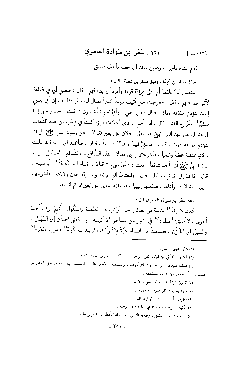 وعن سعر بن سوادة العامري قال: كنت عسيفاً لعقيلة من عقائل الحي أركب لها الصعبة والذلول، أتهم مرة وأنجد أخرى، لا أليق مطرداً في متجر من المتاجر إلا أتيته، يدفعني الحزن إلى السهل. والسهل إلى الحزن، فقدمت من الشام بخرثةٍ وأثاثٍ أريد به كبة العرب ودهماء