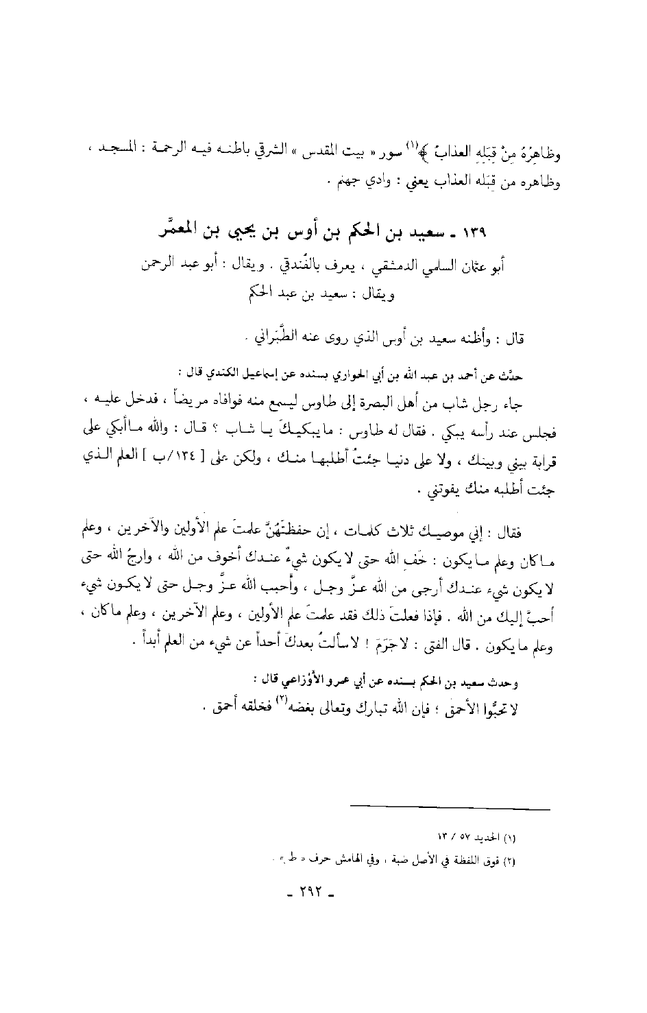 فقال: إني موصيك ثلاث كلمات، إن حفظتهن علمت علم الأولين والآخرين، وعلم ما كان وعلم ما يكون: خف الله حتى لا يكون شيء عندك أخوف من الله، وارج الله حتى لا يكون شيء عندك أرجى من الله عز وجل، وأحبب الله عز وجل حتى لا يكون شيء أحب إليك من الله. فإذا فعلت ذلك فقد علمت علم الأولين، وعلم الآخرين، وعلم ما كان، وعلم ما يكون. قال الفتى: لا جرم! لا سألت بعدك أحداً عن شيء من العلم أبداً.