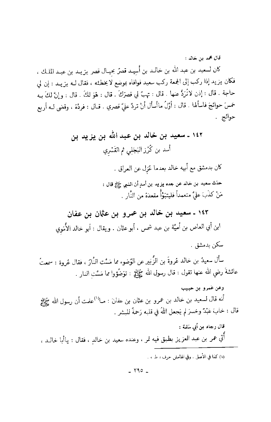 أنه قال لسعيد بن خالد بن عمرو بن عثمان بن عفان: ما علمت أن رسول الله صَلَّى اللهُ عَلَيْهِ وَسَلَّمَ قال: خاب عبدٌ وخسر لم يجعل الله في قلبه رحمةً للبشر قال رجاء بن أبي سلمة: أتي عمر بن عبد العزيز بطبق فيه تمر، وعنده سعيد بن خالدٍ، فقال: يا أبا خالد،