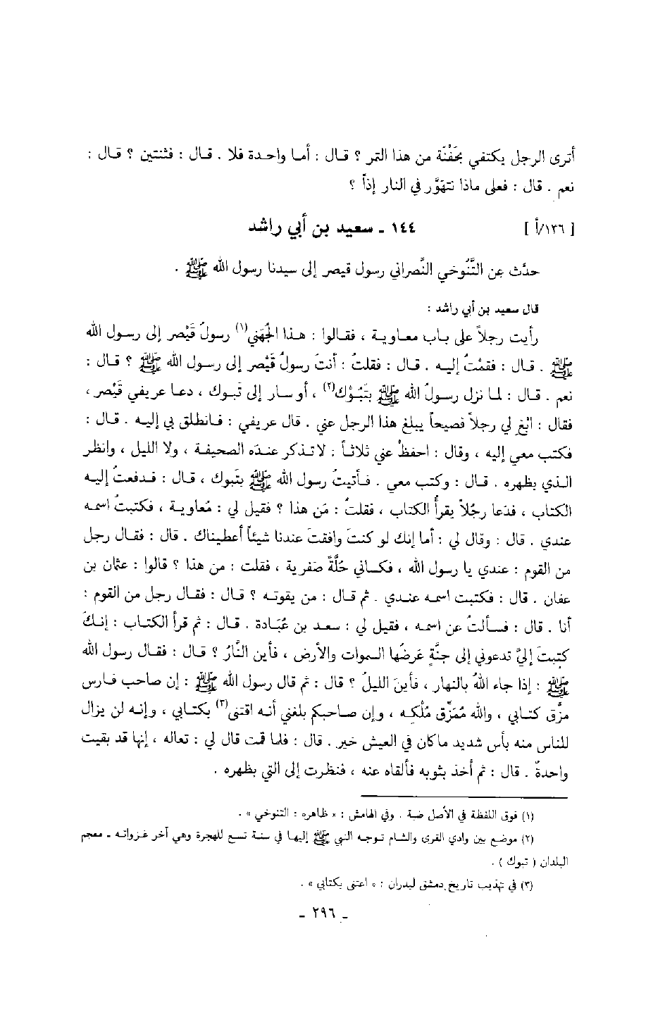 قال سعيد بن أبي راشد: رأيت رجلاً على باب معاوية، فقالوا: هذا الجهني رسول قيصر إلى رسول الله صَلَّى اللهُ عَلَيْهِ وَسَلَّمَ. قال: فقمت إليه. قال: فقلت: أنت رسول قيصر إلى رسول الله صَلَّى اللهُ عَلَيْهِ وَسَلَّمَ؟ قال: نعم. قال: لما نزل رسول الله صَلَّى اللهُ عَلَيْهِ وَسَلَّمَ بتبوك، أو سار إلى تبوك، دعا عريفي قيصر، فقال: ابغ لي رجلاً فصيحاً يبلغ هذا الرجل عني. قال عريفي: فانطلق بي إليه. قال: فكتب معي إليه، وقال: احفظ عني ثلاثاً: لا تذكر عنده الصحيفة، ولا الليل، وانظر الذي بظهره. قال: وكتب معي. فأتيت رسول الله صَلَّى اللهُ عَلَيْهِ وَسَلَّمَ بتبوك، قال: فدفعت إليه الكتاب، فدعا رجلاً يقرأ الكتاب، فقلت: من هذا؟ فقيل لي: معاوية، فكتبت اسمه عندي. قال: وقال لي: أما إنك لو كنت وافقت عندنا شيئاً أعطيناك. قال: فقال رجل من القوم: عندي يا رسول الله، فكساني حلةً صفرية، فقلت: من هذا؟ قالوا: عثمان بن عفان. قال: فكتبت اسمه عندي. ثم قال: من يقوته؟ قال: فقال رجل من القوم: أنا. قال: فسألت عن اسمه، فقيل لي: سعد بن عبادة. قال: ثم قرأ الكتاب: إنك كتبت إلي تدعوني إلى جنةٍ عرضها السموات والأرض، فأين النار؟ قال: فقال رسول الله صَلَّى اللهُ عَلَيْهِ وَسَلَّمَ: إذا جاء الله بالنهار، فأين الليل؟ قال: ثم قال رسول الله صَلَّى اللهُ عَلَيْهِ وَسَلَّمَ: إن صاحب فارس مزق كتابي، والله ممزق ملكه، وإن صاحبكم بلغني أنه اقتنى بكتابي، وإنه لن يزال للناس منه بأس شديد ما كان في العيش خير. قال: فلما قمت قال لي: تعاله، إنها قد بقيت واحدةٌ. قال: ثم أخذ بثوبه فألقاه عنه، فنظرت إلى التي بظهره.