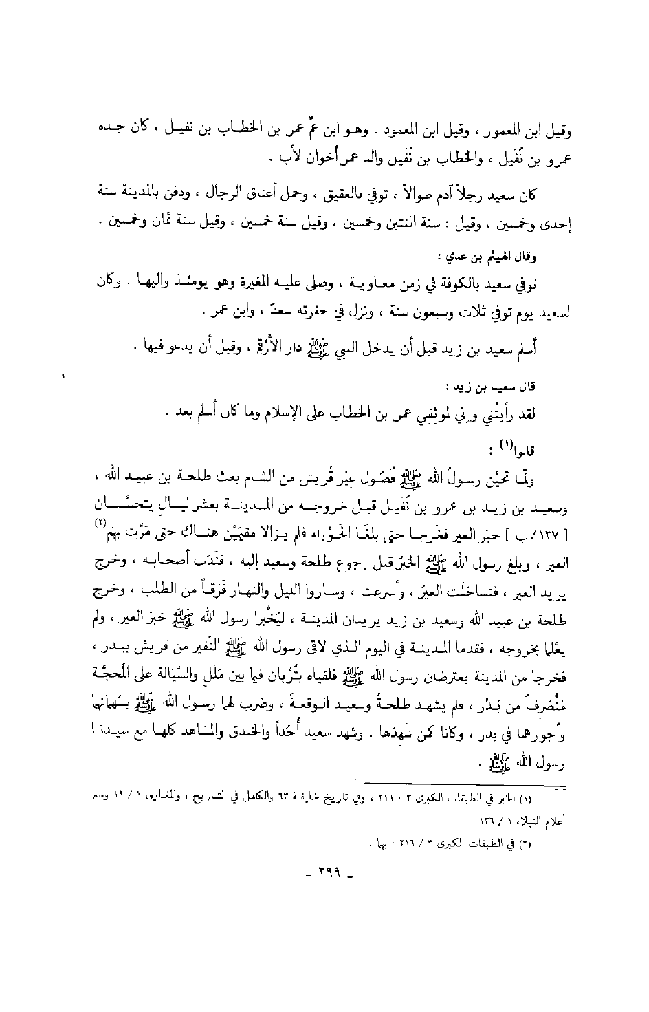 قالوا: ولما تحين رسول الله صَلَّى اللهُ عَلَيْهِ وَسَلَّمَ فصول عير قريش من الشام بعث طلحة بن عبيد الله، وسعيد بن زيد بن عمرو بن نفيل قبل خروجه من المدينة بعشر ليالٍ يتحسسان خبر العير فخرجا حتى بلغا الحوراء فلم يزالا مقيمين هناك حتى مرت بهم العير، وبلغ رسول الله صَلَّى اللهُ عَلَيْهِ وَسَلَّمَ الخبر قبل رجوع طلحة وسعيد إليه، فندب أصحابه، وخرج يريد العير، فتساحلت العير، وأسرعت، وساروا الليل والنهار فرقاً من الطلب، وخرج طلحة بن عبيد الله وسعيد بن زيد يريدان المدينة، ليخبرا رسول الله صَلَّى اللهُ عَلَيْهِ وَسَلَّمَ خبر العير، ولم يعلما بخروجه، فقدما المدينة في اليوم الذي لاقى رسول الله صَلَّى اللهُ عَلَيْهِ وَسَلَّمَ النفير من قريش ببدر، فخرجا من المدينة يعترضان رسول الله صَلَّى اللهُ عَلَيْهِ وَسَلَّمَ فلقياه بتربان فيما بين مللٍ والسيالة على المحجة منصرفاً من بدر، فلم يشهد طلحة وسعيد الوقعة، وضرب لهما رسول الله صَلَّى اللهُ عَلَيْهِ وَسَلَّمَ بسهمانهما وأجورهما في بدر، وكانا كمن شهدها. وشهد سعيد أحداً والخندق والمشاهد كلها من سيدنا رسول الله صَلَّى اللهُ عَلَيْهِ وَسَلَّمَ.