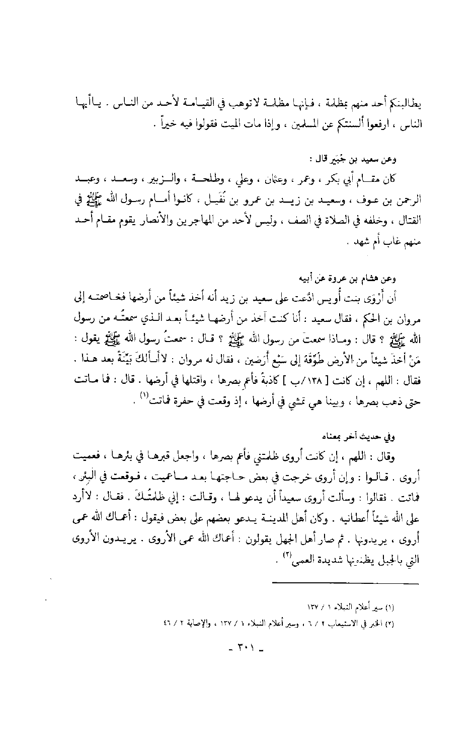 وعن هشام بن عروة عن أبيه: أن أروى بنت أويس ادعت على سعيد بن زيد أنه أخذ شيئاً من أرضها فخاصمته إلى مروان بن الحكم، فقال سعيد: أنا كنت آخذ من أرضها شيئاً بعد الذي سمعته من رسول الله صَلَّى اللهُ عَلَيْهِ وَسَلَّمَ؟ قال: وماذا سمعت من رسول الله صَلَّى اللهُ عَلَيْهِ وَسَلَّمَ؟ قال: سمعت رسول الله صَلَّى اللهُ عَلَيْهِ وَسَلَّمَ يقول: من أخذ شيئاً من الأرض طوقه إلى سبع أرضين، فقال له مروان: لا أسألك بينةً بعد هذا. فقال: اللهم، إن كانت كاذبةً فأعم بصرها، واقتلها في أرضها. قال: فما ماتت حتى ذهب بصرها، وبينا هي تمشي في أرضها، إذ وقعت في حفرة فماتت.