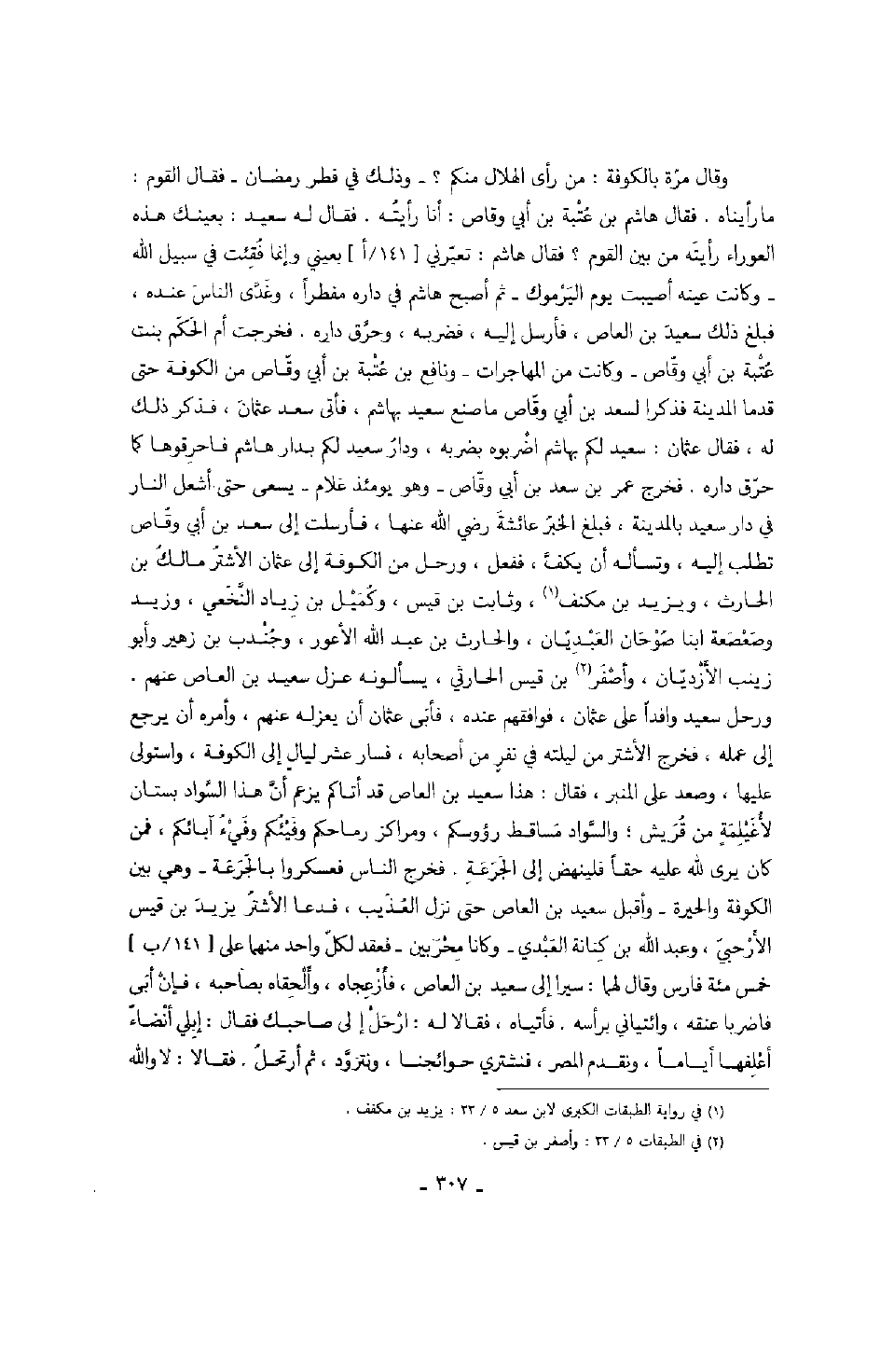 وقال مرة بالكوفة: من رأى الهلال منكم؟ وذلك في فطر رمضان فقال القوم: ما رأيناه. فقال هاشم بن عتبة بن أبي وقاص: أنا رأيته. فقال له سعيد: بعينك هذه العوراء رأيته من بين القوم؟ فقال هاشم: تعيرني بعيني وإنما فقئت في سبيل الله وكانت عينه أصيبت يوم اليرموك ثم أصبح هاشم في داره مفطراً، وغدى الناس عنده فبلغ ذلك سعيد بن العاص، فأرسل إليه، فضربه، وحرق داره. فخرجت أم الحكم بنت عتبة بن أبي وقاص وكانت من المهاجرات ونافع بن عتبة بن أبي وقاص من الكوفة حتى قدما المدينة فذكرا لسعد بن أبي وقاص ما صنع سعيد بهاشم، فأتى سعد عثمان، فذكر ذلك له، فقال عثمان: سعيد لكم بهاشم اضربوه بضربه، ودار سعيد لكم بدار هاشم فاحرقوها كما حرق داره. فخرج عمر بن سعد بن أبي وقاص وهو يومئذٍ غلام يسعى حتى أشعل النار في دار سعيد بالمدينة، فبلغ الخبر عائشة رضي الله عنها، فأرسلت إلى سعد بن أبي وقاص تطلب إليه، وتسأله أن يكف، ففعل، ورحل من الكوفة إلى عثمان الأشتر مالك بن الحارث، ويزيد بن مكنف، وثابت بن قيس، وكميل بن زياد النخعي، وزيد وصعصعة ابنا صوحان العبديان، والحارث بن عبد الله الأعور، وجندب بن زهير وأبو زينب الأزديان، وأصفر بن قيس الحارثي، يسألونه عزل سعيد بن العاص عنهم. ورحل سعيد وافداً على عثمان، فوافقهم عنده، فأبى عثمان أن يعزله عنهم، وأمره أن يرجع إلى عمله، فخرج الأشتر من ليلته في نفرٍ من أصحابه، فسار عشر ليالٍ إلى الكوفة، واستولى عليها، وصعد على المنبر، فقال: هذا سعيد بن العاص قد أتاكم يزعم أن هذا السواد بستان لأغيلمةٍ من قريش، والسواد مساقط رؤوسكم، ومراكز رماحكم وفيئكم وفيء آبائكم، فمن كان يرى لله عليه حقاً فلينهض إلى الجرعة. فخرج الناس فعسكروا بالجرعة وهي بين الكوفة والحيرة وأقبل سعيد بن العاص حتى نزل العذيب، فدعا الأشتر يزيد بن قيس الأرحبي، وعبد الله بن كنانة العبدي وكانا محربين فعقد لكل واحد منهما على خمس مئة فارس وقال لهما: سيرا إلى سعيد بن العاص، فأزعجاه، وألحقاه بصاحبه، فإن أبى فاضربا عنقه، وائتياني برأسه. فأتياه، فقالا له: ارحل إلى صاحبك فقال: إبلي أنضاءٌ أعلفها أياماً، ونقدم المصر، فنشتري حوائجنا، ونتزود، ثم أرتحل. فقالا: لا والله