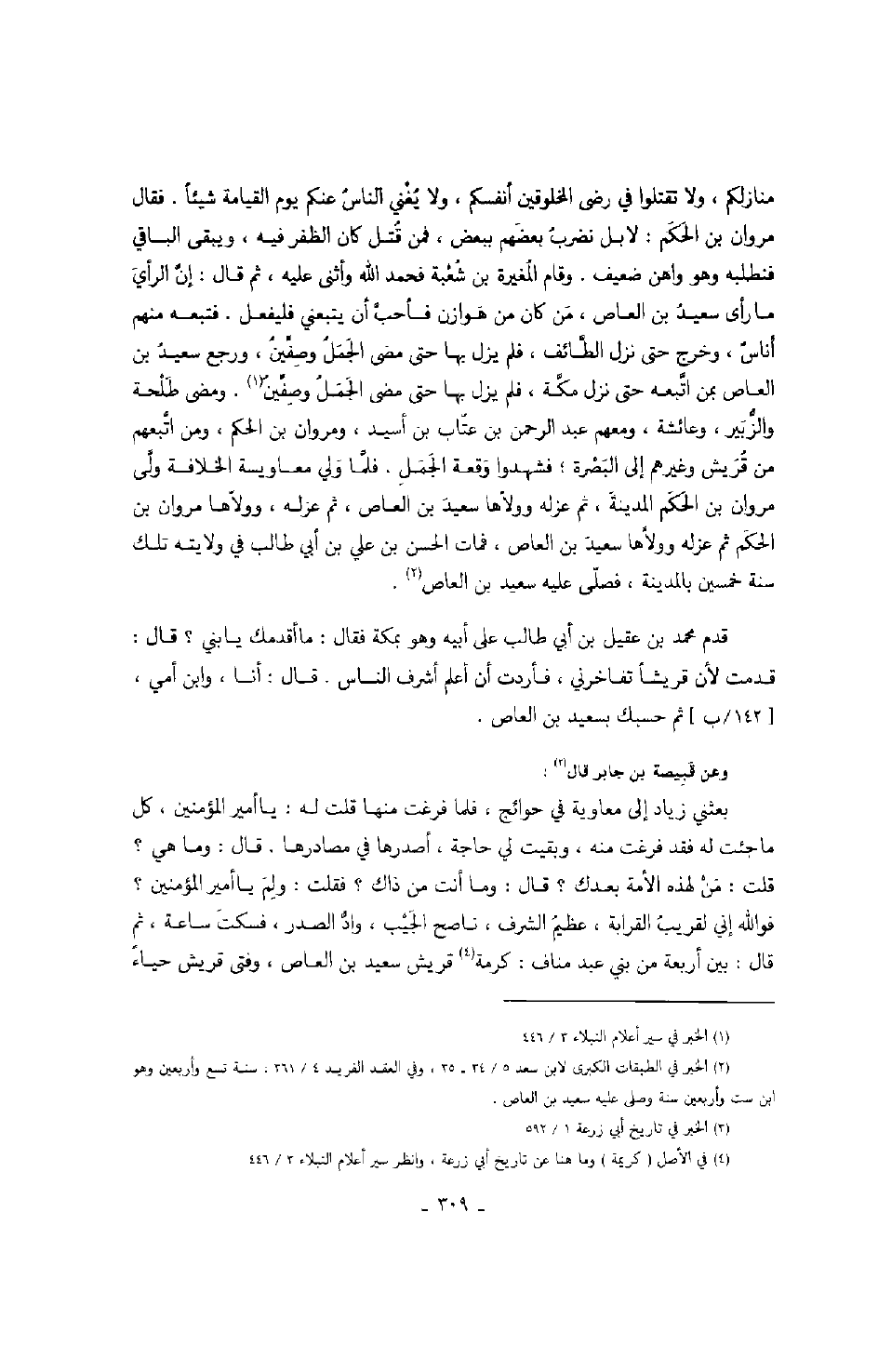 منازلكم، ولا تقتلوا في رضى المخلوقين أنفسكم، ولا يغني الناس عنكم يوم القيامة شيئاً. فقال مروان بن الحكم: لا بل نضرب بعضهم ببعض، فمن قتل كان الظفر فيه، ويبقى الباقي فنطلبه وهو واهن ضعيف. وقام المغيرة بن شعبة فحمد الله وأثنى عليه، ثم قال: إن الرأي ما رأى سعيد بن العاص، من كان من هوازن فأحب أن يتبعني فليفعل. فتبعه منهم أناسٌ، وخرج حتى نزل الطائف، فلم يزل بها حتى مضى الجمل وصفين، ورجع سعيد بن العاص بمن اتبعه حتى نزل مكة، فلم يزل بها حتى مضى الجمل وصفين. ومضى طلحة والزبير، وعائشة، ومعهم عبد الرحمن بن عتاب بن أسيد، ومروان بن الحكم، ومن اتبعهم من قريش وغيرهم إلى البصرة، فشهدوا وقعة الجمل. فلما ولي معاوية الخلافة ولى مروان بن الحكم المدينة، ثم عزله وولاها سعيد بن العاص، ثم عزله، وولاها مروان بن الحكم ثم عزله وولاها سعيد بن العاص، فمات الحسن بن علي بن أبي طالب في ولايته تلك سنة خمسين بالمدينة، فصلى عليه سعيد بن العاص.