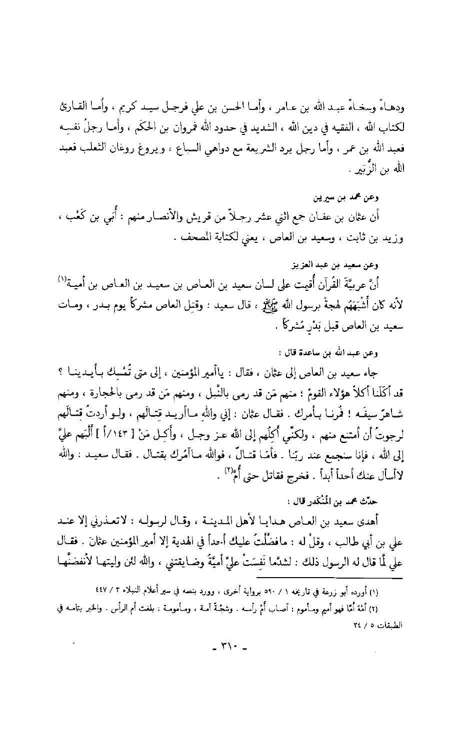 وعن محمد بن سيرين: أن عثمان بن عفان جمع اثني عشر رجلاً من قريش والأنصار منهم: أبي بن كعب، وزيد بن ثابت، وسعيد بن العاص، يعني لكتابة المصحف.