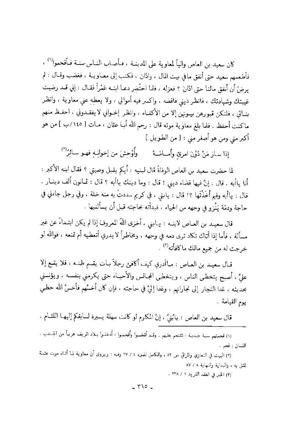 كان سعيد بن العاص والياً لمعاوية على المدينة، فأصاب الناس سنة فأقحموا، فأطعمهم سعيد حتى أنفق ما في بيت المال، فكتب إلى معاوية، فغضب وقال: لم يرض أن أنفق مالنا حتى ادان؟ فعزله، فلما احتضر دعا ابنه عمراً فقال: إني قد رضيت غيبتك وشهادتك، فانظر ديني فاقضه، واكسر فيه أموالي، ولا يعطه عني معاوية، وانظر بناتي، فلتكن قبورهن بيوتهن إلا من الأكفاء، وانظر إخواني لا يفقدوني، احفظ منهم ما كنت أحفظ. فلما بلغ معاوية موته قال: رحم الله أبا عثمان، مات من هو أكبر مني ومن هو أصغر مني: من الطويل