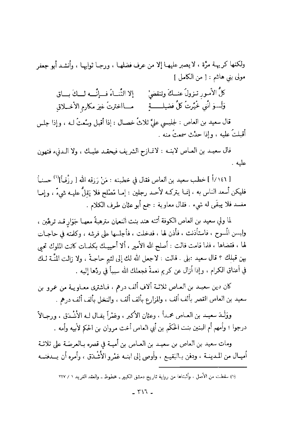 كان دين سعيد بن العاص ثلاثة آلاف ألف درهم، فاشترى معاوية من عمرو بن سعيد بن العاص القصر بألف ألف، والمزارع بألف ألف، والنخل بألف ألف درهم.