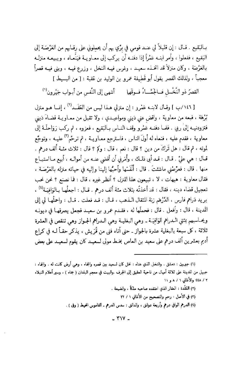 بالبقيع. قال: إن قليلاً لي عند قومي في بري بهم أن يحملوني على رقابهم من العرصة إلى البقيع، ففعلوا، وأمر ابنه عمراً إذا دفنه أن يركب إلى معاوية فينعاه، ويبيعه منزله بالعرصة، وكان منزلاً قد اتخذه سعيد، وغرس فيه النخل، وزرع فيه، وبنى فيه قصراً معجباً، ولذلك القصر يقول أبو قطيفة عمرو بن الوليد بن عقبة: من البسيط