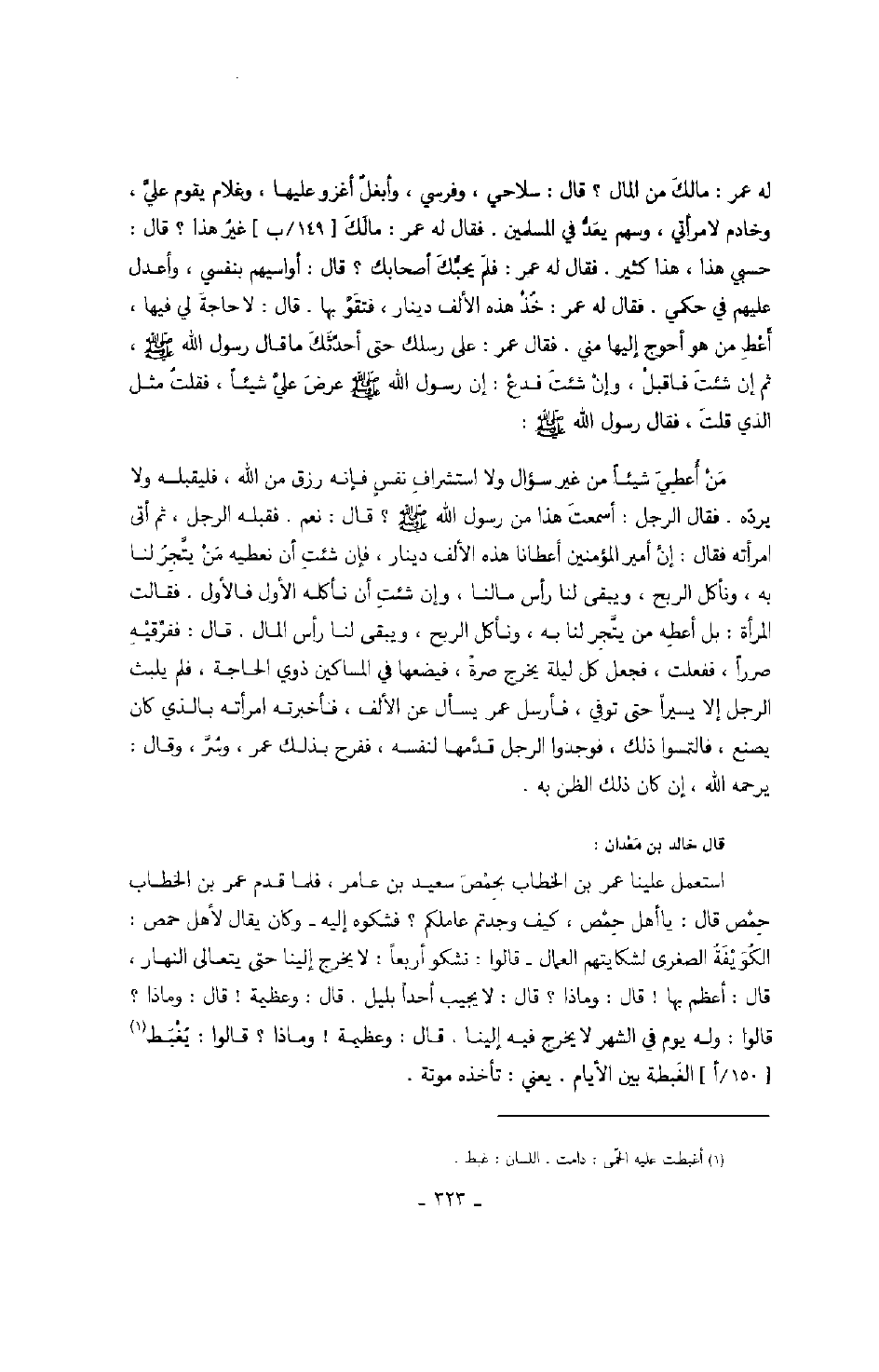 له عمر: مالك من المال؟ قال: سلاحي، وفرسي، وأبغل أغزو عليها، وغلام يقوم علي، وخادم لامرأتي، وسهم يعد في المسلمين. فقال له عمر: مالك غير هذا؟ قال حسبي هذا، هذا كثير. فقال له عمر: فلم يحبك أصحابك؟ قال: أواسيهم بنفسي، وأعدل عليهم في حكمي. فقال له عمر: خذ هذه الألف دينار، فتقو بها. قال: لا حاجة لي فيها، أعط من هو أحوج إليها مني. فقال عمر: على رسلك حتى أحدثك ما قال رسول الله صَلَّى اللهُ عَلَيْهِ وَسَلَّمَ، ثم إن شئت فاقبل، وإن شئت فدع: إن رسول الله صَلَّى اللهُ عَلَيْهِ وَسَلَّمَ عرض علي شيئاً، فقلت مثل الذي قلت، فقال رسول الله صَلَّى اللهُ عَلَيْهِ وَسَلَّمَ.