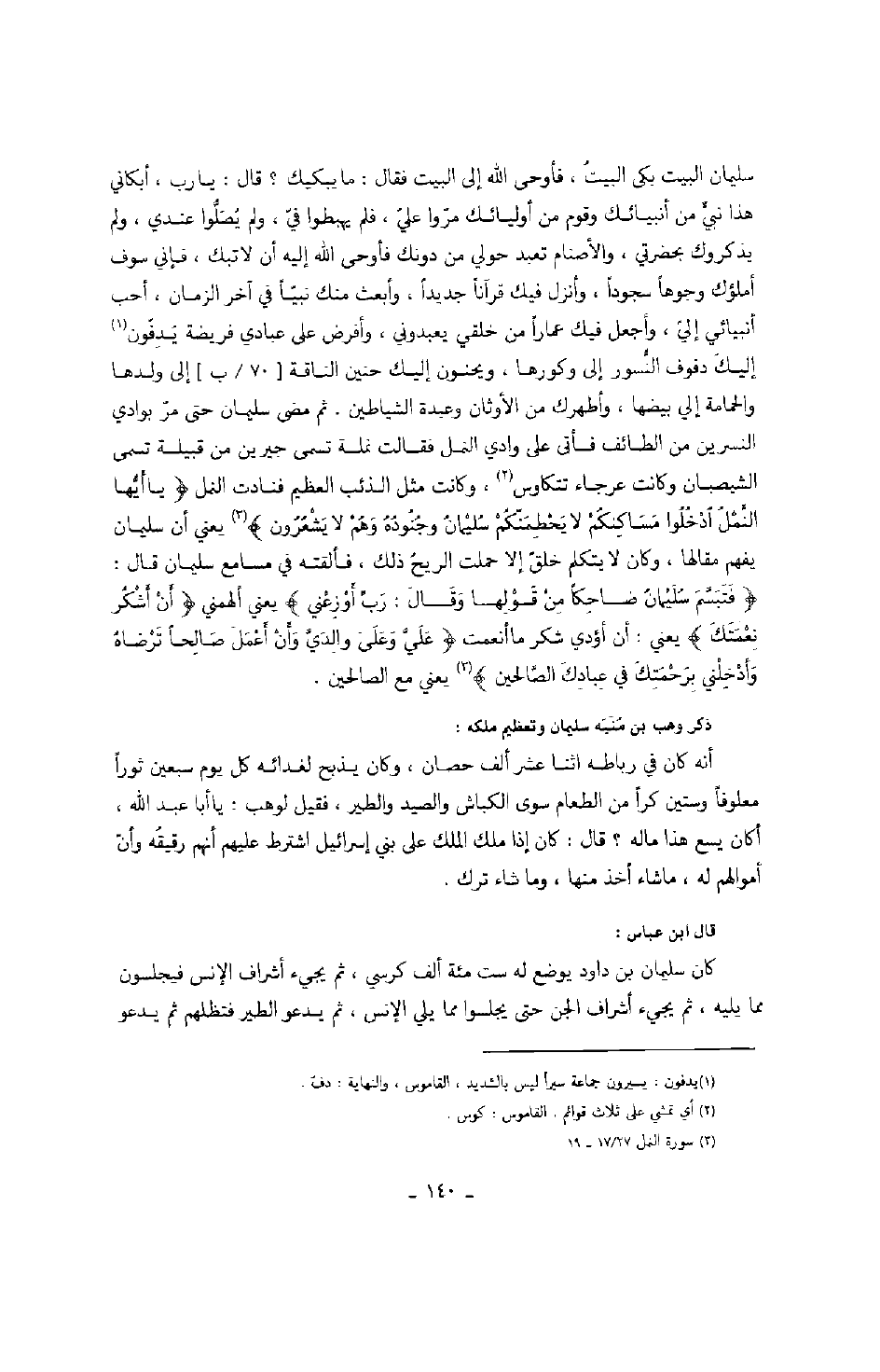 سليمان البيت بكى البيت، فأوحى الله إلى البيت فقال: ما يبكيك؟ قال: يا رب، أبكاني هذا نبي من أنبيائك وقوم من أوليائك مروا علي، فلم يهبطوا في، ولم يصلوا عندي، ولم يذكروك بحضرتي، والأصنام تعبد حولي من دونك فأوحى الله إليه أن لا بتك، فإني سوف أملؤك وجوهاً سجوداً، وأنزل فيك قرآناً جديداً، وأبعث منك نبياً في آخر الزمان، أحب أنبيائي إلي، وأجعل فيك عمارً من خلقي يعبدوني، وأفرض على عبادي فريضة يدفون إليك دفوف النسور إلى وكورها، ويحنون إليك حنين الناقة إلى ولدها والحمامة إلى بيضها، وأطهرك من الأوثان وعبدة الشياطين. ثم مضى سليمان حتى مر بوادي النسرين من الطائف فأتى على وادي النمل فقالت نملة تسمى جيرين من قبيلة تسمى الشيصبان وكانت عرجاء تتكاوس، وكانت مثل الذئب العظيم فنادت النمل " يا أيها النمل ادخلوا مساكنكم لا يحكمنكم سليمان وجنوده وهم لا يشعرون " يعني أن سليمان يفهم مقالها، وكان لا يتكلم خلق إلا حملت الريح ذلك، فألقته في مسامع سليمان قال: " فتبسم سليمان ضاحكاً من قولها وقال: رب أوزعني " يعني ألهمني " أن أشكر نعمتك " يعني: أن أؤدي شكر ما أنعمت " علي وعلى والدي وأن أعمل صالحاً ترضاه وأدخلني برحمتك في عبادك الصالحين " يعني مع الصالحين.