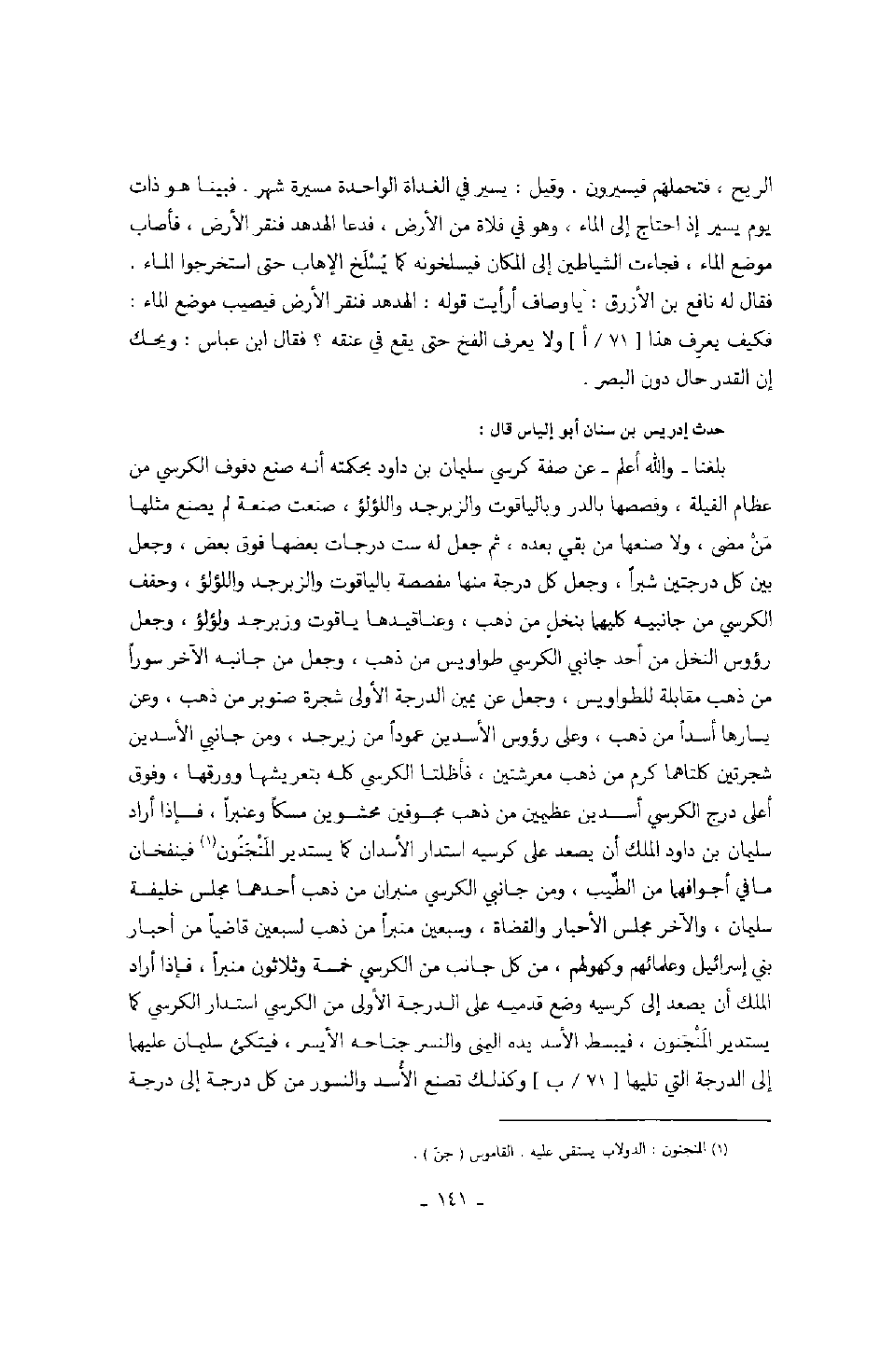 بلغنا " والله أعلم " عن صفة كرسي سليمان بن داود بحكمته أنه صنع دفوف الكرسي من عظام الفيلة، وفصصها بالدر وبالياقوت والزبرجد واللؤلؤ، صنعت صنعة لم يصنع مثلها من مضى، ولا صنعها من بقي بعده، ثم جعل له ست درجات بعضها فوق بعض، وجعل بين كل درجتين شبراً، وجعل كل درجة منها مفصصة بالياقوت والزبرجد واللؤلؤ، وحفف الكرسي من جانبيه كليهما بنخل من ذهب، وعناقيدها ياقوت وزبرجد ولؤلؤ، وجعل رؤوس النخل من أحد جانبي الكرسي طواويس من ذهب، وجعل من جانبه الآخر سوراً من ذهب مقابلة للطواويس، وجعل عن يمين الدرجة الأولى شجرة صنوبر من ذهب، وعن يسارها أسداً من ذهب، وعلى رؤوس الأسدين عموداً من زبرجد، ومن جانبي الأسدين شجرتين كلتاهما كرم من ذهب معرشتين، فأظلتا الكرسي كله بتعريشها وورقها، وفوق أعلى درج الكرسي أسدين عظيمين من ذهب مجوفين محشوين مسكاً وعنبراًً، فإذا أراد سليمان بن داود الملك أن يصعد على كرسيه استدار الأسدان كما يستدير المنجنون فينفخان ما في أجوافهما من الطيب، ومن جانبي الكرسي منبران من ذهب أحدهما مجلس خليفة سليمان، والآخر مجلس الأحبار والقضاة، وسبعين منبراً من ذهب لسبعين قاضياً من أحبار بني إسرائيل وعلمائهم وكهولهم، من كل جانب من الكرسي خمسة وثلاثون منبراً، فإذا أراد الملك أن يصعد إلى كرسيه وضع قدميه على الدرجة الأولى من الكرسي استدار الكرسي كما يستدير المنجنون، فيبسط الأسد يده اليمنى والنسر جناحه الأيسر، فيتكئ سليمان عليها إلى الدرجة التي تليها وكذلك تصنع الأسد والنسور من كل درجة إلى درجة
