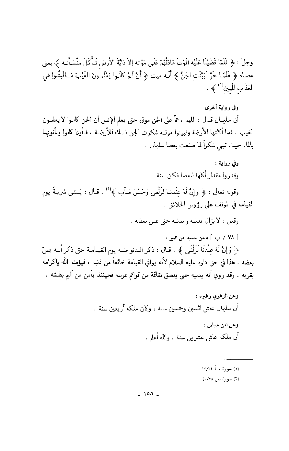 وعن الزهري وغيره: أن سليمان عاش اثنتين وخمسين سنة، وكان ملكه أربعين سنة.
