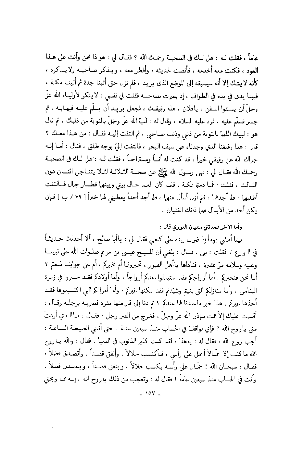 وأما الآخر فحدثني سفيان الثوري قال: بينا أمشي يوماً ضرب بيده على كتفي فقال لي: يا أبا صالح، ألا أحدثك حديثاً في الورع؟ فقلت: بلى. قال: بلغني أن المسيح عيسى بن مريم صلوات الله على نبينا وعليه وسلامه مر بمقبرة، فناداها يا أهل القبور، تخبرونا أم نخبركم، أم عن جوابنا مُنعتم؟ أما نحن فنخبركم: أما أزواجكم فقد استبدلوا بعدكم أزواجاً، وأما أولادكم فقد حشروا في زمرة اليتامى، وأما منازلكم التي بنيتم وشيدتم فقد سكنها غيركم، وأما أموالكم التي اكتسبتموها فقد أخذها غيركم، هذا خبر ما عندنا فما عندكم؟ ثم دنا إلى قبر منها مفرد فضربه برجله وقال: أقسمت عليك إلا قمت بإذن الله عزّ وجلّ، فخرج من القبر رجل، فقال: ما الذي أردت منه يا روح الله؟ فإني لواقف في الحساب منذ سبعين سنة. حتى أتتني الصيحة الساعة: أجب روح الله، فقال له: يا هذا، لقد كنت كثير الذنوب في الدنيا، فقال: والله يا روح الله ما كنت إلا حمالاً أحمل على رأسي، فأكتسب حلالاً، وأنفق قصداً، وأتصدق فضلاً، فقال: سبحان الله! حمال على رأسه يكسب حلالاً. وينفق قصداً، ويتصدق فضلاً، وأنت في الحساب منذ سبعين عاماً! فقال له: وتعجب من ذلك يا روح الله، إنه مما وبخني