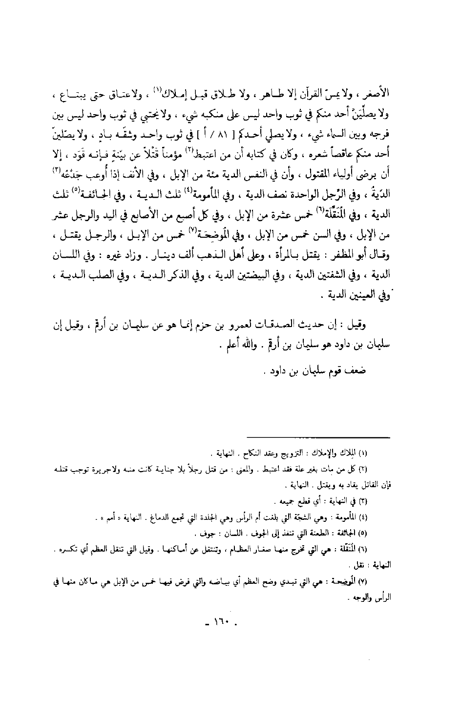 الأصغر، ولا يمس القرآن إلا طاهر، ولا طلاق قبل إملاك، ولا عتاق حتى يبتاع، ولا يصلين أحد منكم في ثوب واحد ليس على منكبه شيء، ولا يحتبي في ثوب واحد ليس بين فرجه وبين السماء شيء، ولا يصلي أحكم في ثوب واحد وشقه باد، ولا يصلين أحد منكم عاقصاً شعره، وكان في كتابه أن من اعتبط مؤمنا ً قَتلاً عن بينه فإنه قود، إلا أن يرضى أولياء المقتول، وأن النفس الدية مئة من الإبل، وفي الأنف إذا أُوعب جدعه الدية، وفي الرجل الواحدة نصف الدية، وفي المأمومة ثلث الدية، وفي الجائفة ثلث الدية، وفي المنقلة خمس عشرة من الإبل، وفي كل أصبع من الأصابع في اليد والرجل عشر من الإبل، وفي السن خمس من الإبل وفي الموضحة خمس من الإبل، والرجل يقتل، وقال أبو المظفر: يقتل بالمرأة، وعلى أهل الذهب ألف دينار. وزاد غيره: وفي اللسان الدية، وفي الشفتين الدية، في البيضتين الدية، وفي الذكر الدية، وفي الصلب الدية، وفي العينين الدية.
