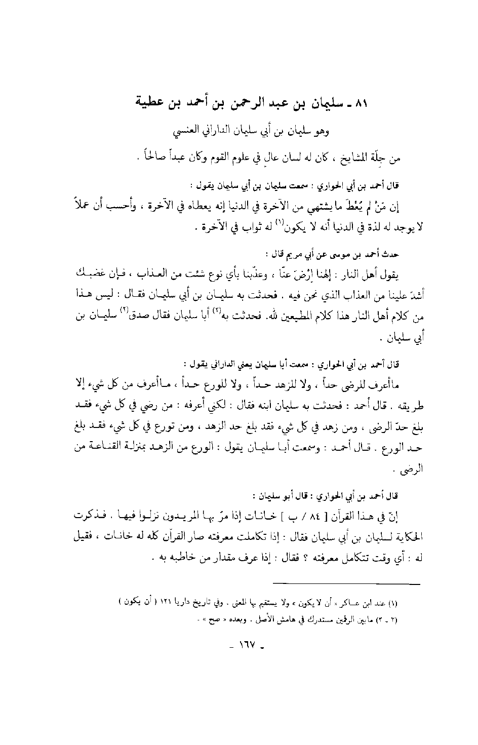 قال بن أبي الحواري: سمعت أبا سليمان يعني الداراني يقول: ما أعرف للرضى حداً، ولا للورع حداً، ما أعرف من كل شيء إلا طريقه. قال أحمد: فحدثت به سليمان ابنه فقال: لكني أعرفه: من رضي في كل شيء فقد بلغ حد الرضى، ومن زهد في كل شيء فقد بلغ حد الزهد، ومن تورع في كل شيء فقد بلغ حد الورع. قال أحمد: وسمعت أبا سليمان يقول: الورع من الزهد بمنزلة القناعة من الرضى.