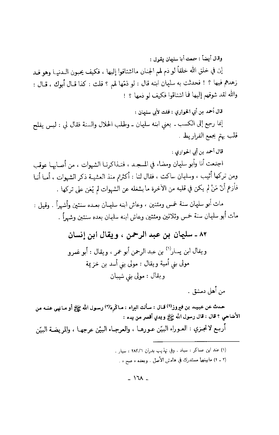 قال أحمد بن أبي الحواري: اجتمعت أنا وأبو سليمان ومضاء في المسجد، فتذاكرنا الشهوات، من أصابها عوقب ومن تركها أثيب، وسليمان ساكت، فقال لنا: أكثرتم منذ العشية في ذكر الشهوات، أما أنا فأزعم أن من لم يكن في قلبه من الآخرة ما يشغله عن الشهوات لم يُعَن على تركها.