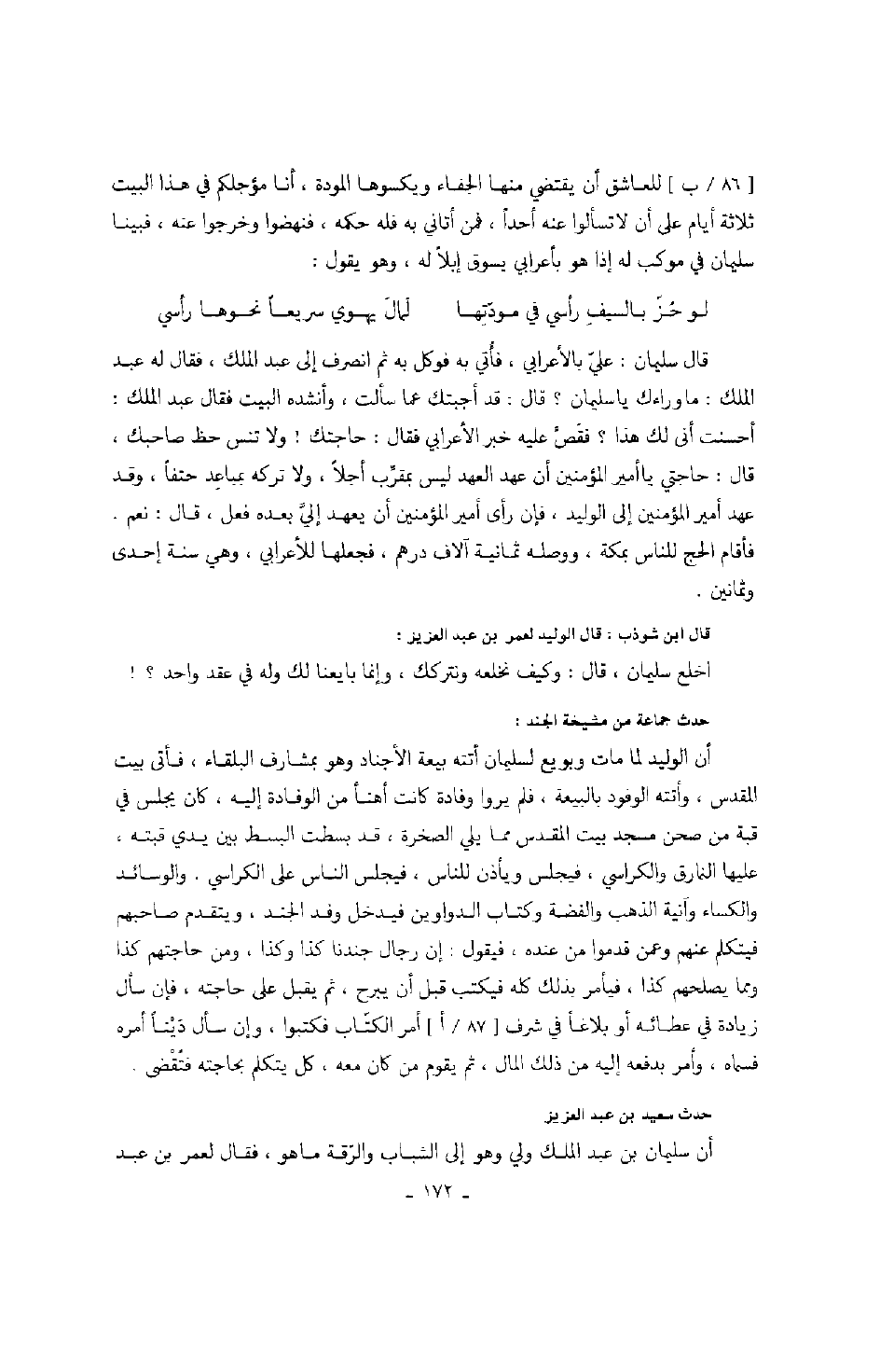 للعاشق أن يقتضي منها الجفاء ويكسوها المودة، أنا مؤجلكم في هذا البيت ثلاثة أيام على أن لا تسألوا عنه أحداً فمن أتاني به فله حكمه، فنهضوا وخرجوا عنه، فبينا سليمان في موكب له إذا هو بأعرابي يسوق إبلاً له، وهو يقول: