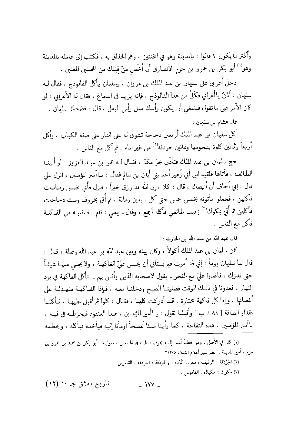 قال هشام بن سليمان: أكل سليمان بن عبد الملك أربعين دجاجة تشوى له على النار على صفة الكباب، وأكل أربعاً وثمانين كلوة بشحومها وثمانين جردقة من غير الماء، ثم أكل مع الناس.