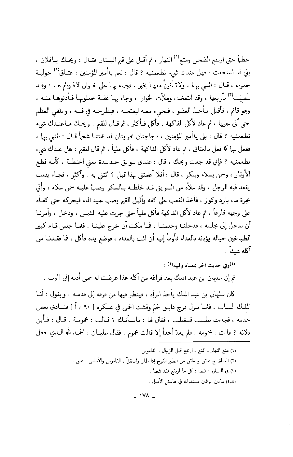 حطماً حتى ارتفع الضحى ومتع النهار، ثم أقبل على قيم البستان فقال: ويحك يا فلان، إني قد استجعت، فهل عندك شيء تطعمنيه؟ قال: نعم يا أمير المؤمنين: عتاق حولية حمراء، قال: ائتني بها، ولا تأتين معها بخبز، فجاء بها على خوان لا قوائم لها، وقد شصيت بأربعها، وقد انتفخت وملأت الخوان، وجاء بها غلمة يحملونها فأدنوها منه، وهو قائم، فأقبل يأخذ العضو فيجيء معه ليفتحه، فيطرحه في فيه، ويلقي العظم حتى أتى عليها، ثم عاد لأكل الفاكهة، فأكل فأكثر، ثم قال للقيم: ويحك ما عندك شيء تطعمنيه؟ قال: بلى يا أمير المؤمنين، دجاجتان بحريتان قد عمتتا شحماً قال: ائتني بهما، ففعل بهما كما فعل بالعتاق، ثم عاد لأكل الفاكهة، فأكل ملياً، ثم قال للقيم: هل عندك شيء تطعمنيه؟ فإني قد جعت ويحك، قال: عندي سويق جديدة يعني الحنطة، كأنه قطع الأوتار، وسمن بسلاء وسكر، قال: أفلا أعلمتني بهذا قبل؟ ائتني به. وأكثِر فجاء بقعب يقعد فيه الرجل، وقد ملأه من السويق قد خلطه بالسكر وصب عليه سمن سلاء، وأتي بجرة ماء بارد وكوز، فأخذ القعب على كفه وأقبل القيم يصب عليه الماء فيحركه حتى كفأه على وجهه فارغاً، ثم عاد لأكل الفاكهة فأكل ملياً حتى جرت عليه الشمس، ودخل، وأمرنا أن ندخل إلى مجلسه، فدخلنا وجلسنا، فما مكث أن خرج علينا. فلما جلس قام كبير الطباخين حياله يؤذنه بالغداء فأومأ إليه أن ائت بالغداء، فوضع يده فأكل، فما فقدنا من أكله شيئاً.