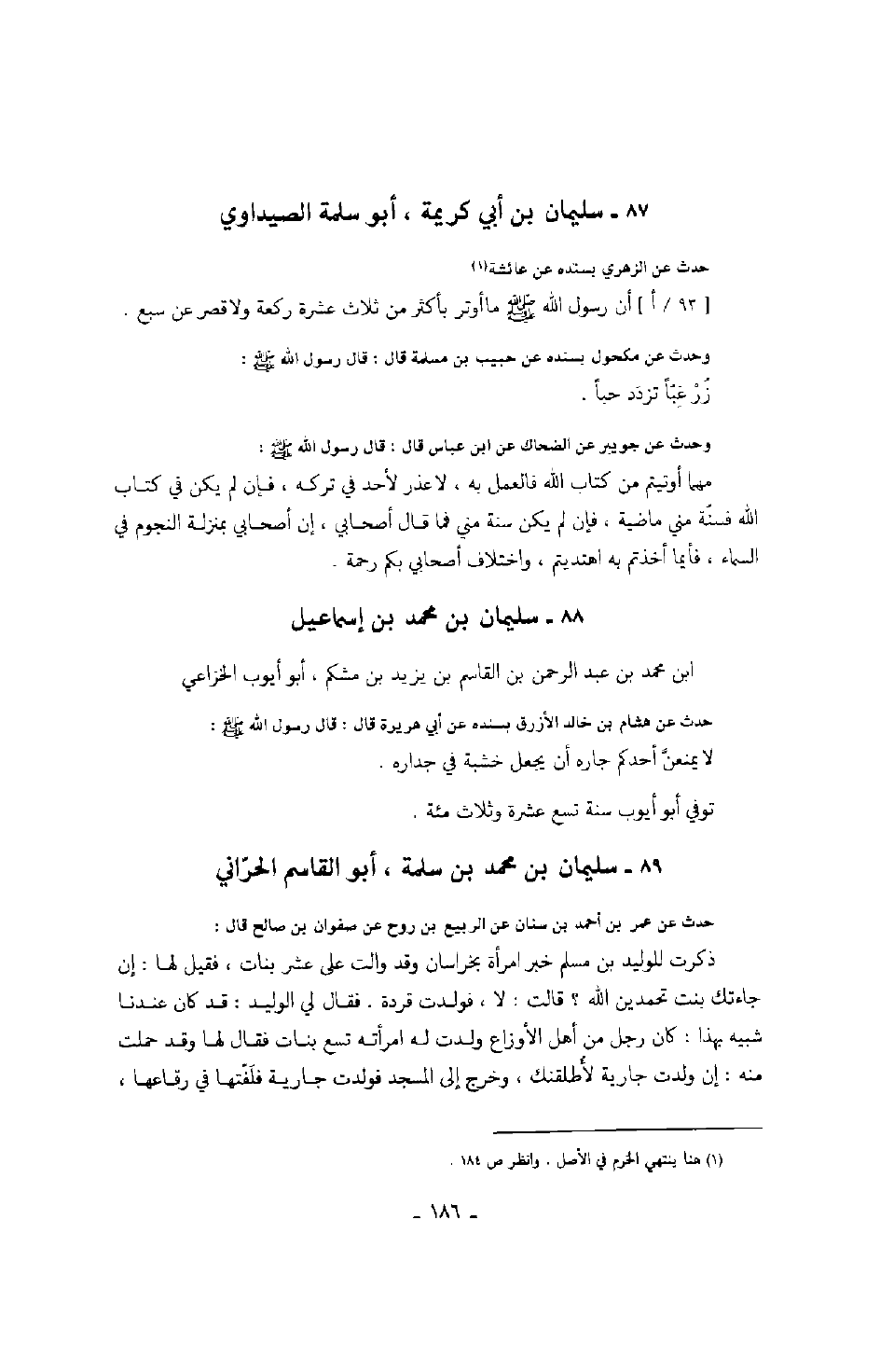 أبو سلمة الصيداوي حدث عن الزهري بسنده عن عائشة أن رسول الله صَلَّى اللهُ عَلَيْهِ وَسَلَّمَ ما أوتر بأكثر من ثلاث عشرة ركعة ولا قصر عن سبعة.