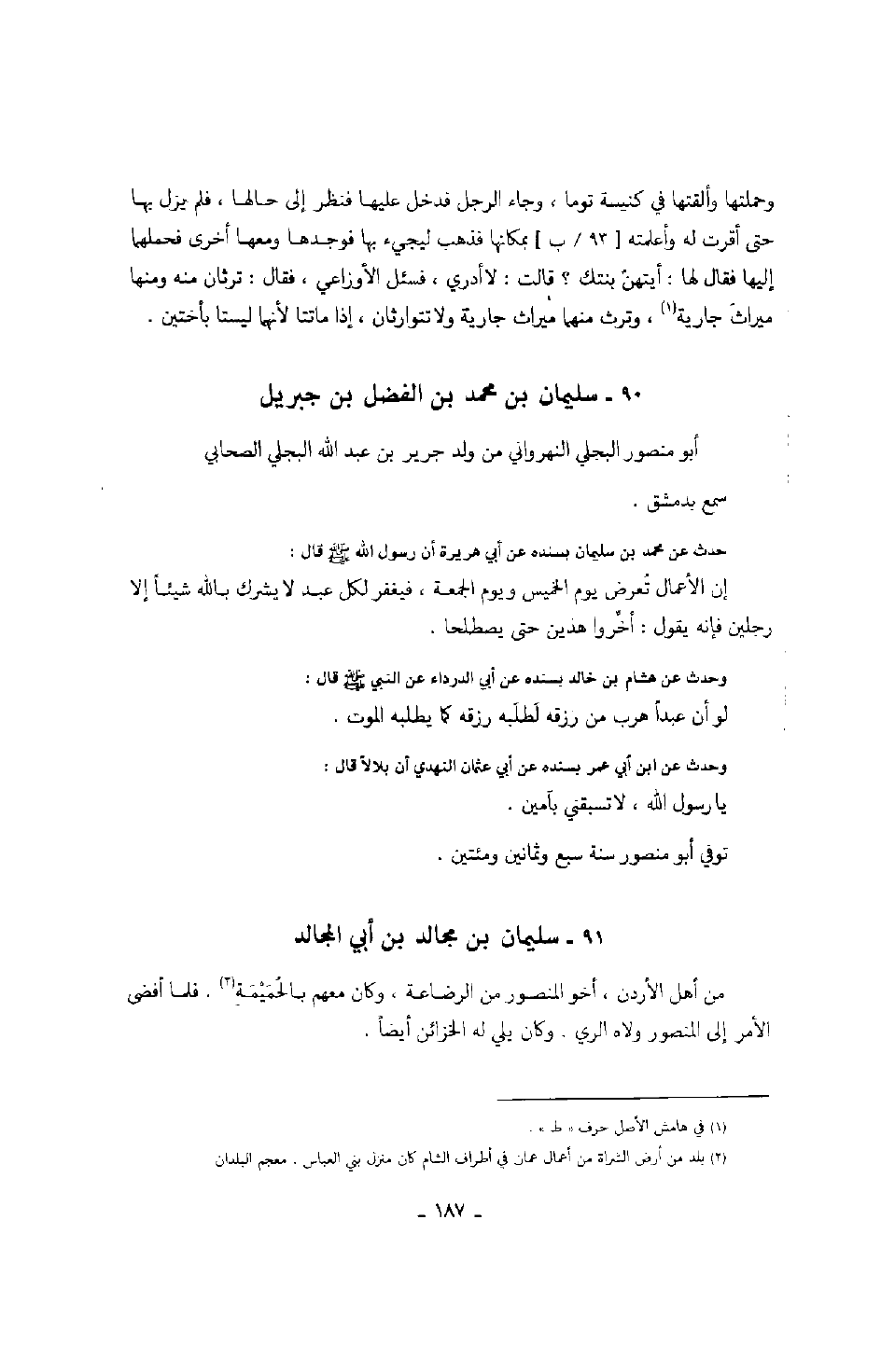 وحملتها وألقتها في كنيسة توما، وجاء الرجل فدخل عليها فنكر إلى حالها، فلم يزل بها حتى أقرت له وأعلمته بمكانها فذهب ليجيء بها فوجدها ومعها أخرى فحملها إليها فقال لها: أيتهن بنتك؟ قالت: لا أدري، فسئل الأوزاعي، فقال: ترثان منه ومنها ميراث جارية، وترث منهما ميراث جارية ولا تتوارثان، إذا ماتتا لأنهما ليستا بأختين.