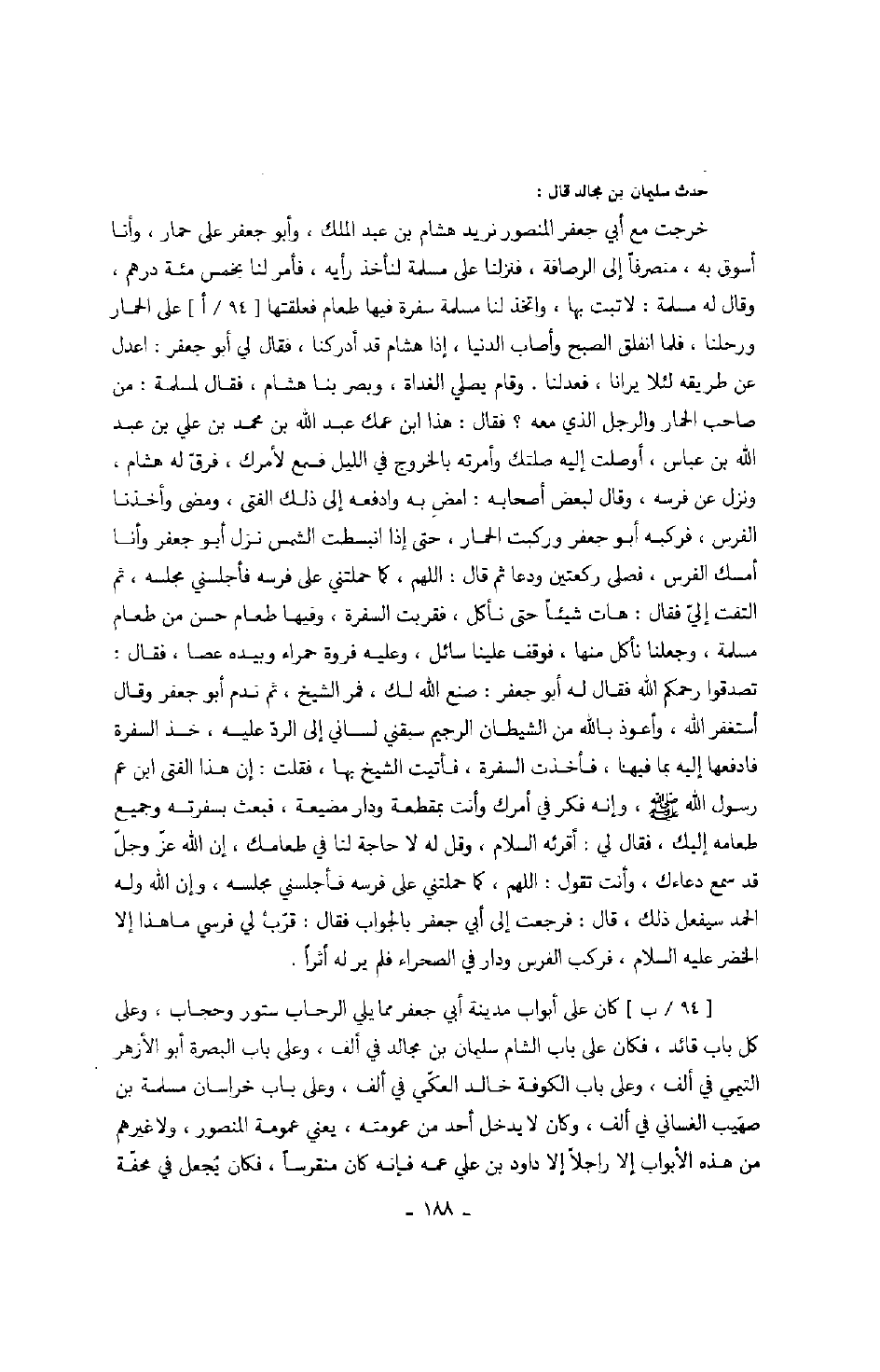 حدث سليمان بن مجالد قال: خرجت مع أبي جعفر المنصور نريد هشام بن عبد الملك، وأبو جعفر على حمار، وأنا أسوق به، منصرفاً إلى الرصافة، فنزلنا على مسلمة لنأخذ رأيه، فأمر لنا بخمس مئة درهم، وقال له مسلمة: لا تبت بها، واتخذ لنا مسلمة سفرة فيها طعاما فعلقتها على الحمار ورحلنا، فلما انفلق الصبح وأصاب الدنيا، إذا هشام قد أدركنا، فقال لي أبو جعفر: اعدل عن طريقه لئلا يرانا، فعدلنا، وقام يصلي الغداة، وبصر بنا هشام، فقال لمسلمة: من صاحب الحمار والرجل الذي معه؟ فقال: هذا ابن عمك عبد الله بن محمد بن علي بن عبد الله بن عباس، أوصلت إليه صلتك وأمرته بالخروج في الليل فسمع لأمرك، رق له هشام، ونزل عن فرسه، وقال لبعض أصحابه: امضِ به وادفعه إلى ذلك الفتى، ومضى وأخذنا الفرس، فركبه أبو جعفر وركبت الحمار، حتى إذا انبسطت الشمس نزل أبو جعفر وأنا أمسك الفرس، فصلى ركعتين ودعا ثم قال: اللهم، كما حملتني على فرسه فأجلسني مجلسه، ثم التفت إلي فقال: هات شيئاً حتى نأكل، فقربت السفرة، وفيها طعام حسن من طعام مسلمة، وجعلنا نأكل منها، فوقف علينا سائل، وعليه فروة حمراء وبيده عصا، فقال: تصدقوا رحمكم الله فقال له أبو جعفر: صنع الله لك، فمر الشيخ، ثم ندم أبو جعفر وقال أستغفر الله، وأعوذ بالله من الشيطان الرجيم سبقني لساني إلى الرد عليه، خذ السفرة فادفعها إليه بما فيهنا، فأخذت السفرة، فأتيت الشيخ بها، فقلت: إن هذا الفتى ابن عم رسول الله صَلَّى اللهُ عَلَيْهِ وَسَلَّمَ، وإنه فكر في أمرك وأنت بمقطعة ودار مضيعة، فبعث بسفرته وجميع طعامه إليك، فقال لي: أقرئه السلام، وقل له لا حاجة لنا في طعامك، إن الله عزّ وجلّ قد سمع دعاءك، وأنت تقول: اللهم، كما حملتني على فرسه فأجلسني مجلسه، وإن الله وله الحم سيفعل ذلك، قال: فرجعت إلى أبي جعفر بالجواب فقال: قرّب لي فرسي ما هذا إلا الخضر عليه السلام، فركب الفرس ودار في الصحراء فلم ير له أثراً.
