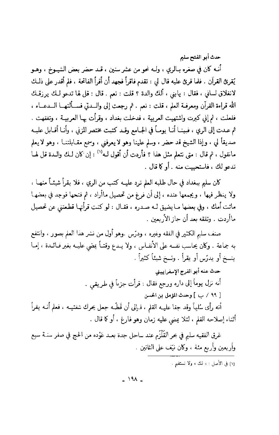 حدث أبو الفتح سليم أنه كان في صغره بالري، وله نحو من عشر سنين، قد حضر بعض الشيوخ، وهو يُقرئ القرآن. فلما قرئ عليه قال لي: تقدم فاقرأ فجهد أن أقرأ الفاتحة، فلم أقدر على ذلك لانغلاق لساني، فقال: يا بني، ألك والدة؟ قالت: نعم. قال: قل لها تدعو لك يرزقك الله قراءة القرآن ومعرفة العلم، قالت: نعم. ثم رجعت إلى والدتي فسألتها الدعاء، ففعلت، ثم إني كبرت واشتهيت العربية، فدخلت بغداد، وقرأت بها العربية، وتفقهت. ثم عدت إلى الري، فبينا أنا يوماً في الجامع وقد كتبت مختصر المزني، وأنا أقابل عليه صديقاً لي، وإذا الشيخ قد حضر، وسلم علينا وهو لا يعرفني، وسمع مقابلتنا، وهو لا يعلم ما نقول، ثم قال: متى نتعلم مثل هذا؟ فأردت أن أقول له: إن كان لك والدة قل لها تدعو لك، فاستحييت منه. أو كما قال.