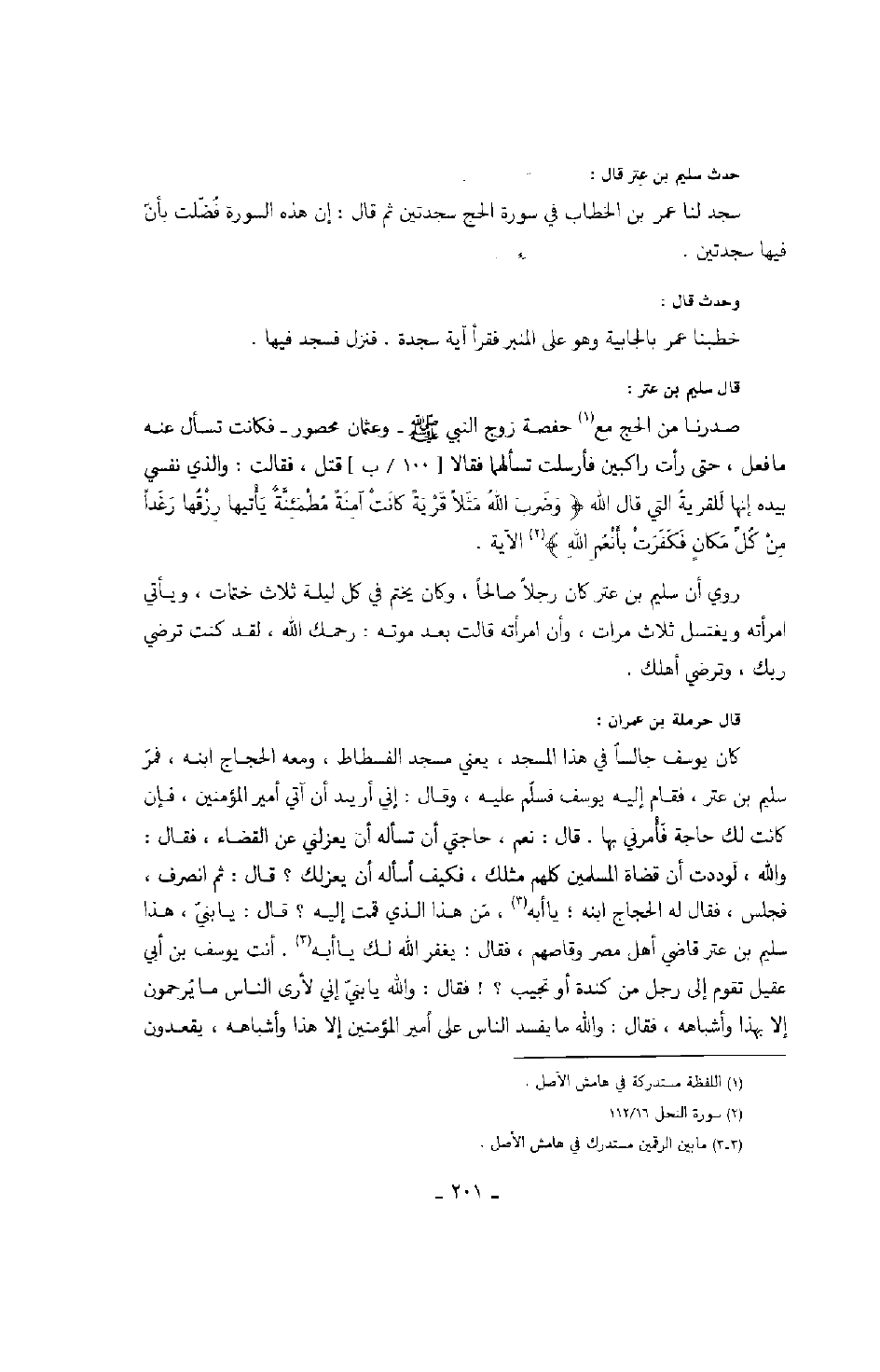 حدث سليم بن عتر قال: سجد لنا عمر بن الخطاب في سورة الحج سجدتين ثم قال: إن هذه السورة فُضلت بأن فيها سجدتين.
