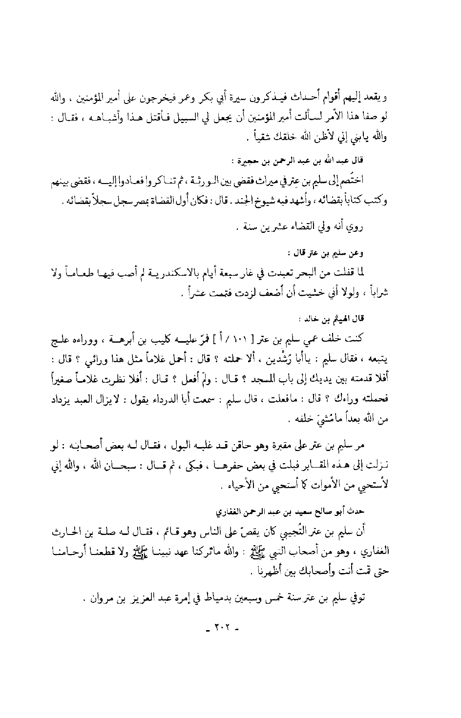 مر سليم بن عتر على مقبرة وهو حاقن قد غلبه البول، فقال له بعض أصحابه: لو نزلت إلى هذه المقابر فبلت في بعض حفرها، فبكى، ثم قال: سبحان الله، والله إني لأستحيي من الأموات كما أستحيي من الأحياء.