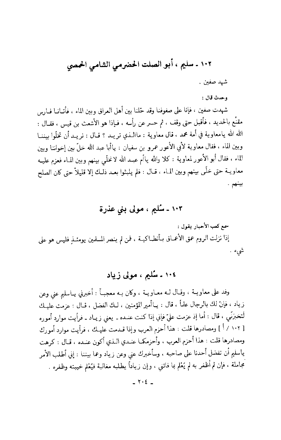 شهد صفين وحدث قال: شهدت صفين، فإنا على صفوفنا وقد حُلنا بين أهل العراق وبين الماء، فأتانا فارس مقنع بالحديد، فأقبل حتى وقف، ثم حسر عن رأسه، فإذا هو الأشعث بن قيس، فقال: الله الله يا معاوية في أمة محمد، قال معاوية: ما الذي تريد؟ قال: نريد أن تخلّوا بيننا وبين الماء، فقال معاوية لأبي الأعور عمرو بن سفيان: يا أبا عبد الله خلّ بين إخواننا وبين الماء، فقال أبو الأعور لمعاوية: كلا والله يا أم عبد الله لا نخلي بينهم وبين الماء فعزم عليه معاوية حتى خلى بينهم وبين الماء، قال: فلم يلبثوا بعد ذلك إلا قليلاً حتى كان الصلح بينهم.