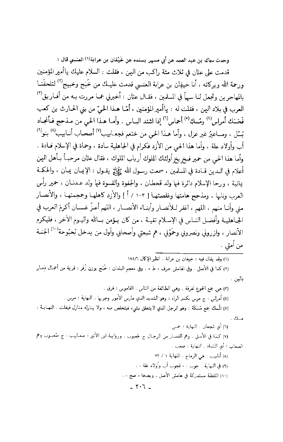 قدمت على عثمان في ثلاث مئة راكب من اليمن، فقلت: السلام عليك يا أمير المؤمنين رحمة الله وبركاته، أنا خيفان بن عرابة العنسي قدمت عليك من خبج وخبيج لتلحقنا بالمهاجرين وتجعل لنا سهماً في المسلمين، فقال عثمان: أخبرني عما مررت به من أفاريق العرب في بلاد اليمن، فقلت له: يا أمير المؤمنين، أما هذا الحي من بني الحارث بن كعب فحسك أمراس ومسك أحماس إذا اشتد الباس. وأما هذا الحي من مذحج فأنجاد بسل، ومساعير غير عزل، وأما هذا الحي من خثعم فجعابيب أصحاب أنابيب بنو أب وأولاد علة، وأما هذا الحي من الأزد فكرام في الجاهلية سادة، وحماة في الإسلام قادة. وأما هذا الحي من حمير فبخٍ بخٍ أولئك الملوك أرباب الملوك، فقال عثمان مرحباً بأهل اليمن أعلم في الدين قادة في المسلمين، سمعت رسول الله صَلَّى اللهُ عَلَيْهِ وَسَلَّمَ يقول: " الإيمان يمان، والحكمة يمانية، ورحا الإسلام دائرة فيما ولد قحطان، والجفوة والقسوة فيما ولد عدنان، حمير رأس العرب ونابها، ومذجح هامتها وغلصمتها والأزد كاهلها وجمجمتها، والأنصار مني وأنا منهم، اللهم، اغفر للأنصار وأبناء الأنصار، اللهم أعزّ غسان أكرم العرب في الجاهلية وأفضل أناس في الإسلام تقية، من كان يؤمن بالله واليوم الآخر، فليكرم الأنصار، وزروني ونصروني وحموني، هم شيعتي وأصحابي وأول من يدخل في بُحبُوحة الجنة من أمتي ".