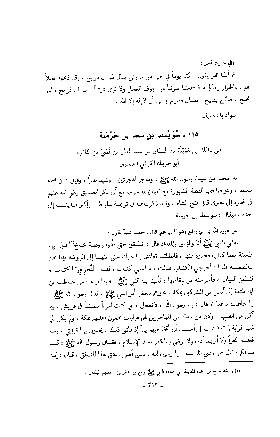 ابن مالك بن عميلة بن السباق بن عبد الدار بن قصي بن كلاب أبو حرملة القرشي العبدري له صحبة من سيدنا رسول الله ص، وهاجر الهجرتين، وشهد بدراً، وقيل: إن اسمه سليط، وهو صاحب القصة المشهورة مع نعيمان لما خرجا مع أبي بكر الصديق رضي الله عنهم في تجارة إلى بصرى قبل فتح الشام، وقد ذكرناها في ترجمة سليط. وأكثر ما ينسب إلى جده، فيقال: سويبط بن حرملة.