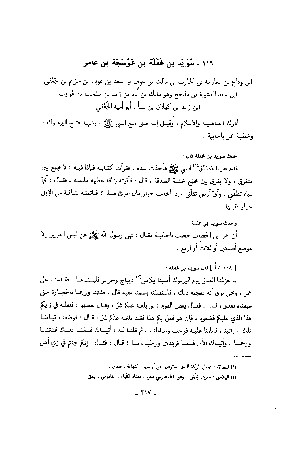 حدث سويد بن غفلة قال: قدم علينا مصدق النبي صَلَّى اللهُ عَلَيْهِ وَسَلَّمَ فأخذت بيده، فقرأت كتابه فإذا فيه: لا يجمع بين متفرق، ولا يفرق بين مجتمع خشية الصدقة، قال: فأتيته بناقة عظيمة ململمة، فقال: أي سماء تظلني، وأي أرض تقلني، إذا أخذت خيار مال امرئ مسلم؟ فأتيته بناقة من الإبل خيار فقبلها.