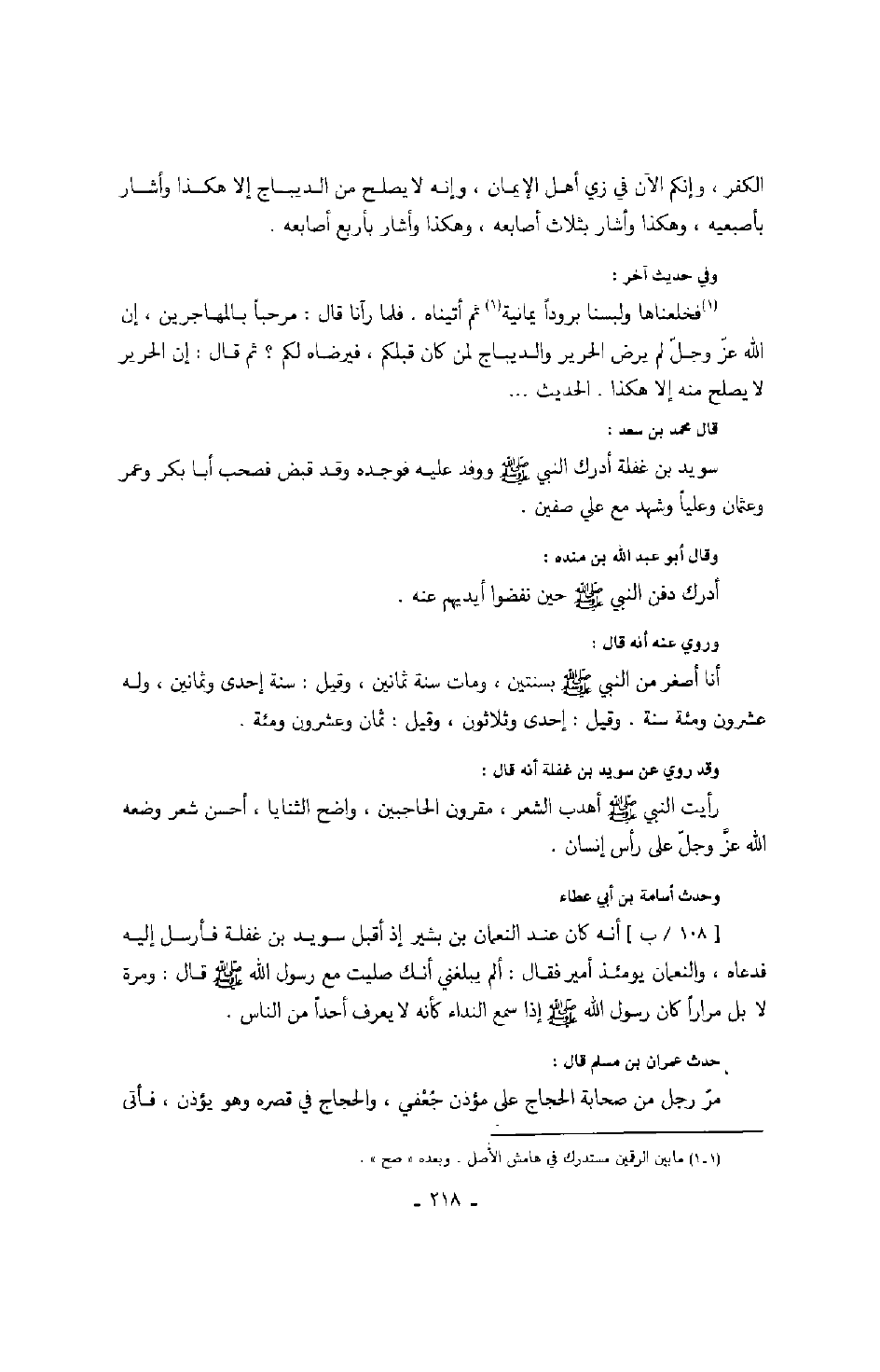 أنه كان عند النعمان بن بشير إذا أقبل سويد بن غفلة فأرسل إليه فدعاه، والنعمان يومئذ أمير فقال: ألم يبلغني أنك صليت مع رسول الله صَلَّى اللهُ عَلَيْهِ وَسَلَّمَ قال: ومرة لا بل مرار كان رسول الله صَلَّى اللهُ عَلَيْهِ وَسَلَّمَ إذا سمع النداء كأنه لا يعرف أحداً من الناس.