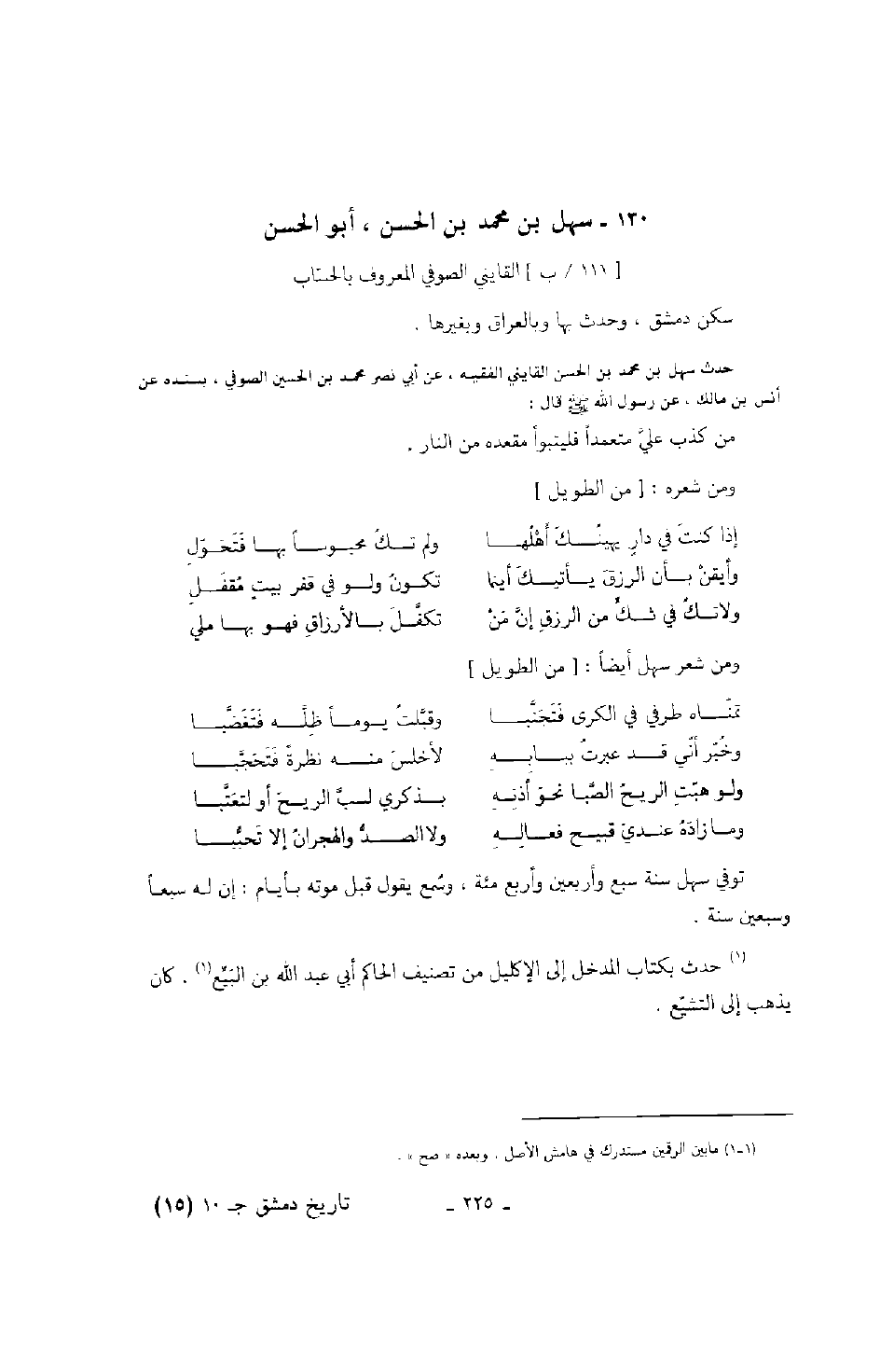 حدث سهل بن محمد بن الحسن القايني الفقيه، عن أبي نصر محمد بن الحسين الصوفي، بسنده عن أنس بن مالك، عن رسول الله صَلَّى اللهُ عَلَيْهِ وَسَلَّمَ قال: من كذب عليّ متعمداً فليتبوأ مقعده من النار.
