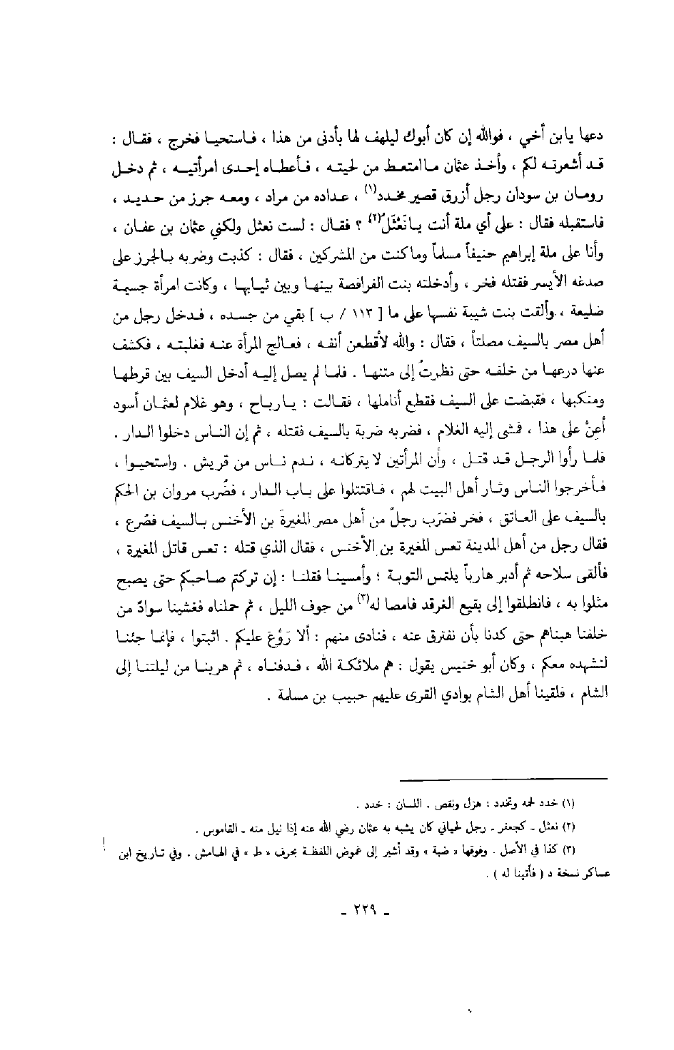 دعها يا ابن أخي، فوالله إن كان أبوك ليلهف لها بأدنى من هذا، فاستحيا فخرج، فقال: قد أشعرته لكم، وأخذ عثمان ما امتعط من لحيته، فأعطاه إحدى امرأتيه، ثم دخل رومان بن سودان رجل أزرق قصير مخدد، عداده من مراد، ومعه جرز من حديد، فاستقبله فقال: على أي ملة أنت يا نعثل؟ فقال: لست بنعثل ولكني عثمان بن عفان، وأنا على ملة إبراهيم حنيفاً مسلماً وما كنت من المشركين، فقال: كذبت وضربه بالجزر على صدغه الأيسر فقتله فخر، وأدخلته بنت الفرافصة بينها وبين ثيابها، وكانت امرأة ضليعة، وألقت بنت شيبة نفسها على ما بقي من جسده، فدخل رجل من أهل مصر بالسيف مصلتاً، فقال: والله لأقطعن أنفه، فعالج المرأة فغلبته، فكشف عنها درعها من خلفه حتى نظرت إلى متنها، فلما لم يصل إليه أدخل السيف بين قرطها ومنكبها، فقبضت على السيف فقطع أناملها، فقالت: يا رباح، وهو غلام أسود لعثمان أعن على هذا، فمشى إليه الغلام، فضربه ضربة بالسيف فقتلهن ثم أن الناس دخلوا الدار فلما رأوا الرجل قد قتل، وأن المرأتين لا يتركانه، ندم ناس من قريش. واستحيوا، فأخرجوا الناس وثار أهل البيت لهم، فاقتتلوا على باب الدار، فضرب مروان بن الحكم بالسيف على العاتق، فخر فضرب رجل من أهل مصر المغيرة بن الأخنس، فقال الذي قتله: تعس قاتل المغيرة، فألقى سلاحه ثم أدبر هارباً يلتمس التوبة، وأمسينا فقلنا: إن تركتم صاحبكم حتى يصبح مثلوا به، فانطلقوا إلى بقيع الغرقد فامصا له من جوف الليل، ثم حملناه فغشينا سواد من خلفنا هبناهم حتى كدنا بأن نفترق عنه، فنادى منهم: ألا روع عليكم. اثبتوا، فإنما جئنا لنشهده معكم، وكان أبو خنيس يقول: هم ملائكة الله، فدفناه، ثم هربنا من ليلتنا إلى الشام، فلقينا أهل الشام بوادي القرى عليهم حبيب بن مسلمة.