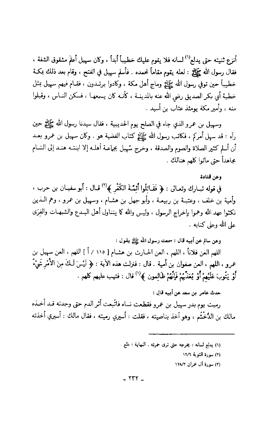 أنزع حتى يدلع لسانه فلا يقوم عليك خطيباً أبداً، وكان سهيل أعلم مشقوق الشفة، فقال رسول الله صَلَّى اللهُ عَلَيْهِ وَسَلَّمَ: لعله يقوم مقاماً نحمده، فأسلم سهيل في الفتح، وقام بعد ذلك بمكة خطيباً حين توفي رسول الله صَلَّى اللهُ عَلَيْهِ وَسَلَّمَ وماج أهل مكة، وكادوا يرتدون، فقام فيهم سهيل بمثل خطبة أبي بكر الصديق رضي الله عنه بالمدينة، وكأنه كان يسمعها، فسكن الناس، وقبلوا منه، وأمير مكة يومئذ عتاب بن أسيد.