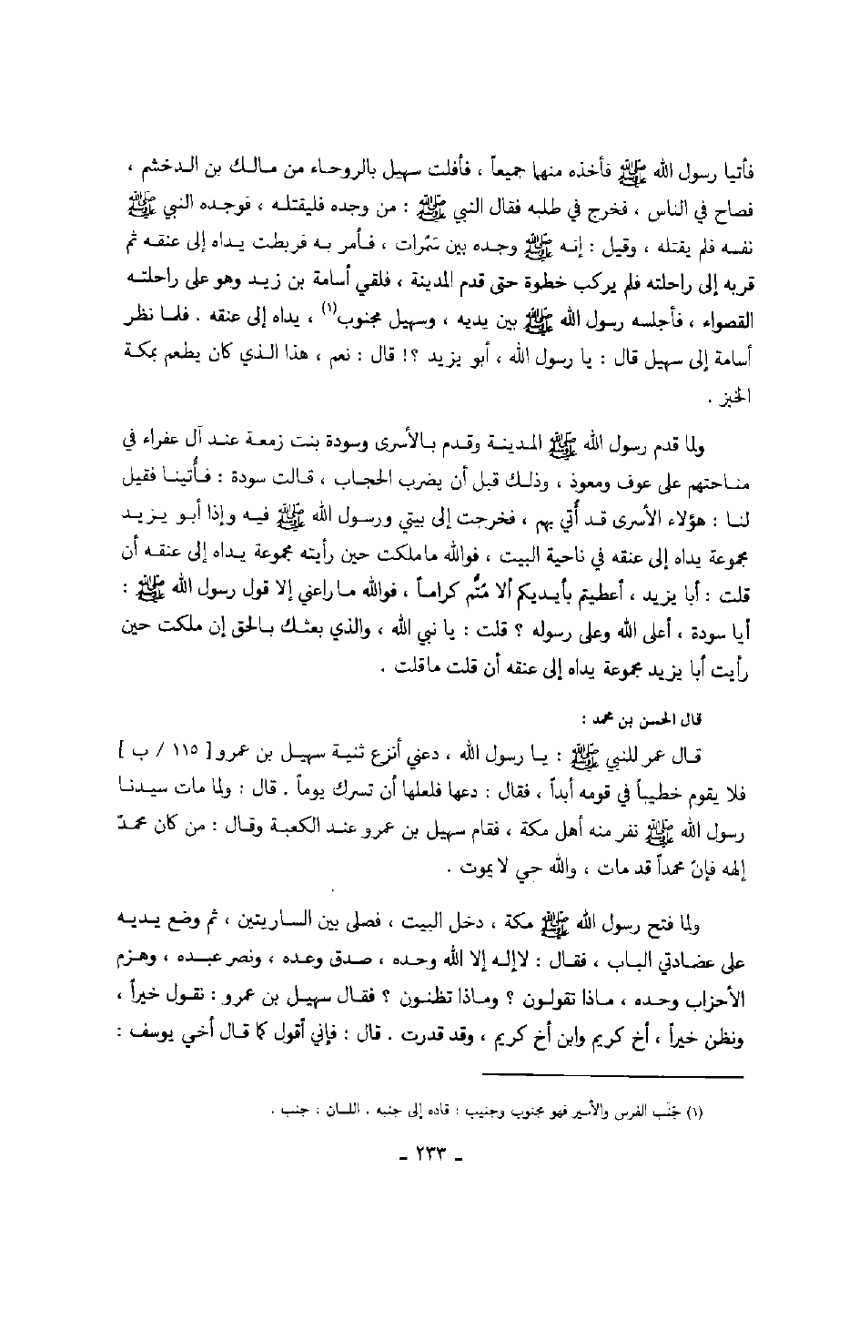 فأتيا رسول الله صَلَّى اللهُ عَلَيْهِ وَسَلَّمَ فأخذه منهما جميعاً، فأفلت سهيل بالروحاء من مالك بن الدخشم، فصاح في الناس، فخرج في طلبه فقال النبي صَلَّى اللهُ عَلَيْهِ وَسَلَّمَ: من وجده فليقتله، فوجده النبي صَلَّى اللهُ عَلَيْهِ وَسَلَّمَ نفسه فلم يقتله، وقيل: أنه صَلَّى اللهُ عَلَيْهِ وَسَلَّمَ وجده بين سمرات، فأمر به فربطتداه إلى عنقه ثم قربه إلى راحلته فلم يركب خطوة حتى قدم المدينة، فلقي أسامة بن زيد وهو على راحلته القصواء، فأجلسه رسول الله صَلَّى اللهُ عَلَيْهِ وَسَلَّمَ بين يديه، وسهيل مجنوب، يداه إلى عنقه. فلما نظر أسامة إلى سهيل قال: يا رسول الله، أبو زيد؟! قال: نعم، هذا الذي كان يطعم بمكة الخبز.
