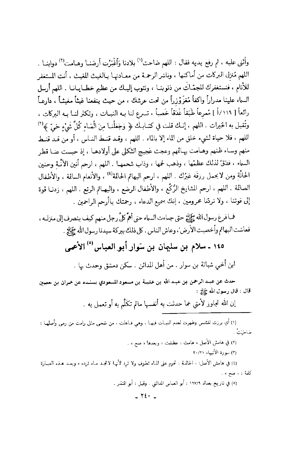 سلام بن سليمان بن سوار أبو العباس الأعمى حدث عن عبد الرحمن بن عبد الله بن عتبة بن مسعود المسعودي بسنده عن عمران بن حصين قال: قال رسول الله صَلَّى اللهُ عَلَيْهِ وَسَلَّمَ: إن الله تجاوز لأمتي عما حدثت به أنفسها ما لم تكلم به أو تعمل به.