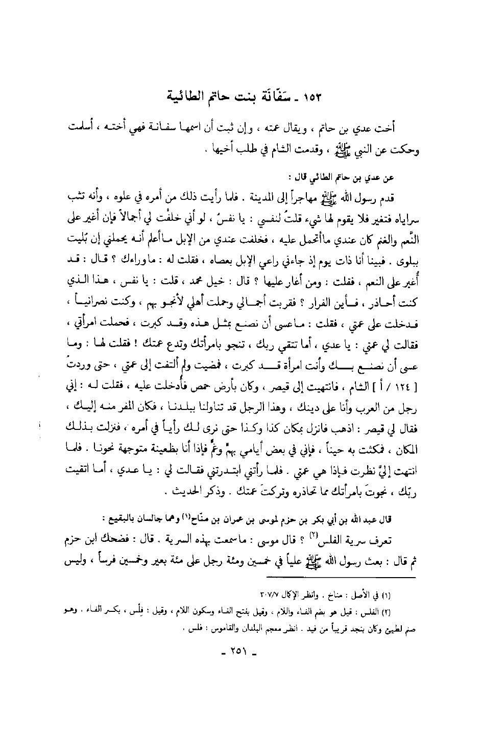 عن عدي بن حاتم الطائي قال: قدم رسول الله صَلَّى اللهُ عَلَيْهِ وَسَلَّمَ مهاجراً إلى المدينة. فلم رأيت ذلك من أمره في علوه، وأنه تثب سراياه فتغير فلا يقوم بشيء قلت لنفسي: يا نفس، لو أني خلقت لي أجمالاً فإن أغير على النعم والغنم كان عندي ما أتحمل عليه، فخلفت عندي من الإبل ما أعلم أنه يحملني إن بليت ببلوى. فبينا أنا ذات يوم إذ جاءني راعي الإبل بعصاه، فقلت له: ما وراءك؟ قال: قد أغير عل النعم، فقلت: ومن أغار عليها؟ قال: خيل محمد، قلت: يا نفس، هذا الذي كنت أحاذر، فأين الفرار؟ فقربت أجمالي وحملت أهلي لأنجو بهم، وكنت نصرانيا، فدخلت على عمتي، فقلت: ما عسى أن نصنع بمثل هذه وقد كبرت، فحملت امرأتي، فقالت عمتي: يا عدي، أما تتقي ربك، نتنجو بامرأتك وتدع عمتك! فقلت لها: وما عسى أن نصنع بك وأنت امرأة قد كبرت، فمضيت ولم ألتفت إلى عمتي، حتى وردت الشام فانتهيت إلى قيصر، وكان بأرض حمص فأدخلت عليه، فقلت له: إني رجل من العرب وأنا على دينك، وهذا الرجل قد تناولنا ببلدنا، فكان المفر منه إليك، فقال لي قيصر: اذهب فانزل بمكان كذا وكذا حتى نرى لك رأياً في أمره، فنزلت لذلك المكان، فمكثت به حيناً، فإني في بعض أيامي بهم وغم فإذا أنا بظعينة متوجهة نحونا. فلما انتهيت إليّ نظرت فإذا هي عمتي. فلما رأتني ابتدرتني فقالت لي: يا عدي، أما اتقيت ربك، نجوت بامرأتك مما تحاذره وتركت عمتك، وذكر الحديث.