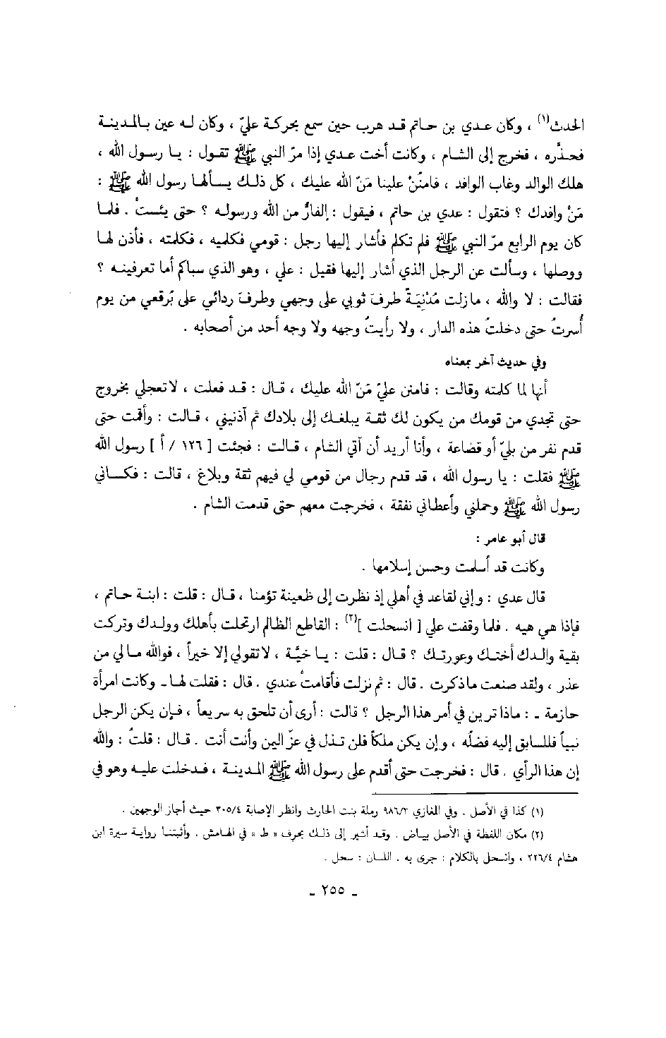 الحدث، وكان عدي بن حاتم قد هرب حين سمع بحركة علي، وكان له عين بالمدينة فحذره، فخرج إلى الشام، وكانت أخت عدي إذا مر النبي صَلَّى اللهُ عَلَيْهِ وَسَلَّمَ تقول: يا رسول الله هلك الوالد وعاب الوافد، فامنن علينا منّ الله عليك، كل ذلك يسأله رسول الله صَلَّى اللهُ عَلَيْهِ وَسَلَّمَ: من وافدك؟ فتقول: عدي بن حاتم، فيقول: الفار من الله ورسوله؟ حتى يئست. فلما كان يوم الرابع مرّ النبي صَلَّى اللهُ عَلَيْهِ وَسَلَّمَ فلم تكلم فأشار إليها رجل: قومي فكلميه، فكلمته، فأذن لها ووصلها، وسألت الرجل الذي أشار إليها فقيل: علي، وهو الذي سباكم أما تعرفينه؟ فقالت: لا والله، ما زلت مدنية طرف ثوبي على وجهي وطرف ردائي على برقعي من يوم أسرت حتى دخلت هذه الدار، ولا رأيت وجهه ولا وجه أحد من أصحابه.