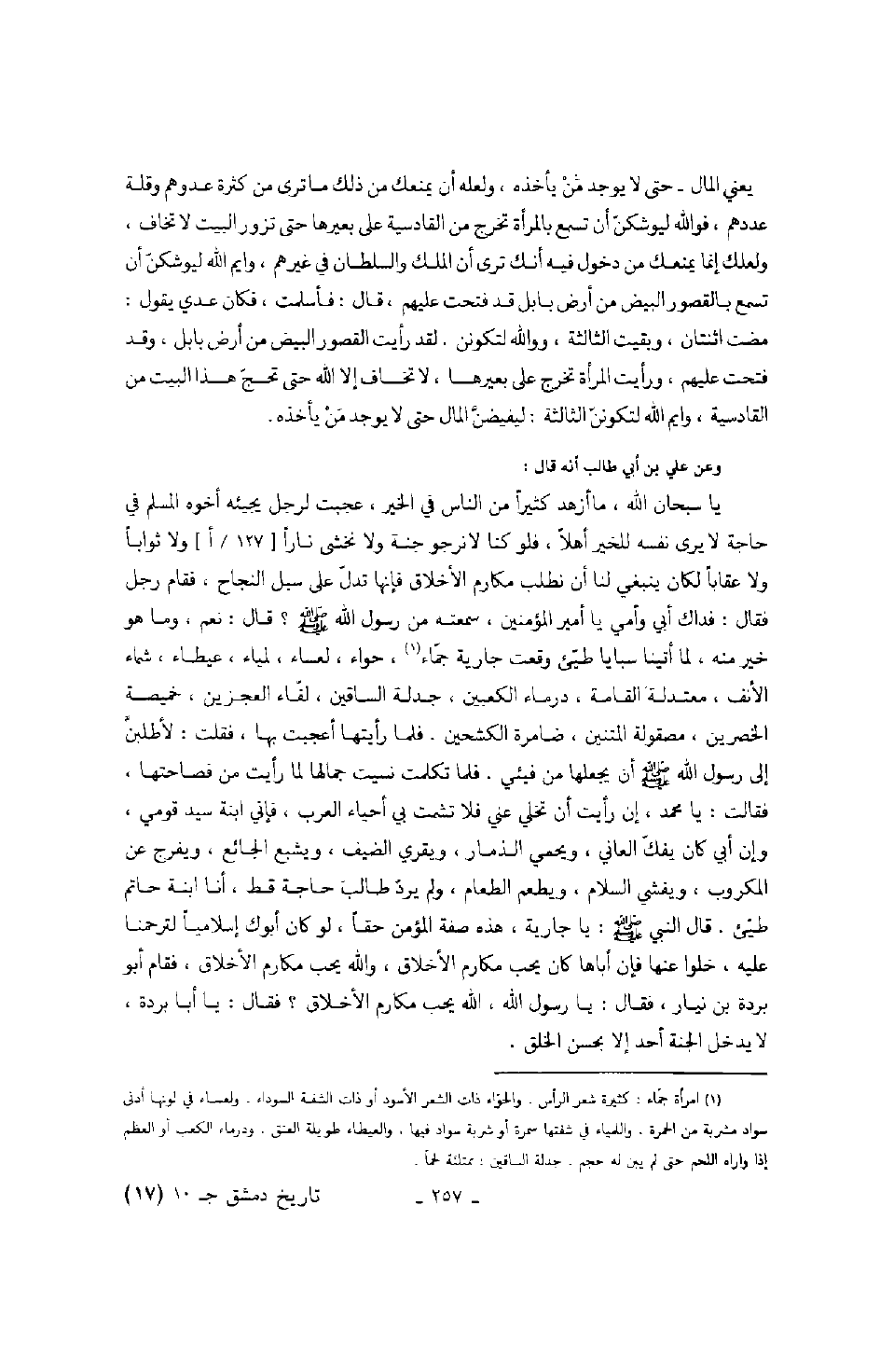 وعن علي بن أبي طالب أنه قال: يا سبحان الله، ما أزهد كثيراً من الناس في الخير، عجبت لرجل يجيئه أخوه المسلم في حاجة لا يرى نفسه للخير أهلاً، فلو كنا لا نرجو جنة ولا نخشى ناراً ولا ثواباً ولا عقاباً لكان ينبغي لنا أن نطلب مكارم الأخلاق فإنها تدل على سبل النجاح، فقام رجل فقال: فداك أبي وأمي يا أمير المؤمنين، سمعته من رسول الله صَلَّى اللهُ عَلَيْهِ وَسَلَّمَ؟ قال: نعم، وما هو خير منه، لما أتينا سبايا طيئ وقعت جارية جماء، حواء، لعساء، لمياء، عيطاء، شماء الأنف، معتدلة القامة، درماء الكعبين، جدلة الساقين، لفاء العجزين، خميصة الخصرين، مصقولة المتنين، ضامرة الكشحين، فلما رأيتها أعجبت بها، فقلت: لأطلبن إلى رسول الله صَلَّى اللهُ عَلَيْهِ وَسَلَّمَ أن يجعلها من فيئي. فلما تكلمت نسيت جمالها لما رأيت من فصاحتها، فقالت: يا محمد، إن رأيت أن تخلي عني فلا تشمت بي أحياء العرب، فإني ابنة سيد قومي، وإن أبي كان يفكّ العاني، ويحمي الذمار، ويقري الضيف، ويشبع الجائع، ويفرج عن المكروب، ويفشي السلام، ويطعم الطعام، ولم يرد طالب حاجة قط، أنا ابنة حاتم طيئ، قال النبي صَلَّى اللهُ عَلَيْهِ وَسَلَّمَ: يا جارية، هذه صفة المؤمن حقاً، لو كان أبوك إسلامياً لترحمنا عليه، خلوا عنها فإن أباها كان يحب مكارم الأخلاق، والله يحب مكارم الأخلاق، فقام أبو بردة بن نيار، فقال: يا رسول الله، الله يحب مكارم الأخلاق؟ فقال: يا أبا بردة، لا يدخل الجنة أحد إلا بحسن الخلق.