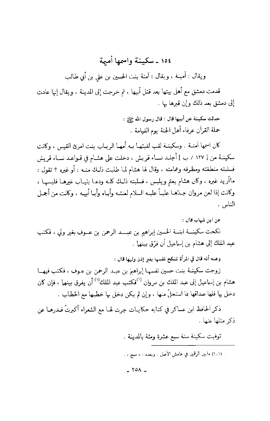عن ابن شهاب قال: نكحت سكينة ابنة الحسين إبراهيم بن عبد الرحمن بن عوف بغير ولي، فكتب عبد الملك إلى هشام بن إسماعيل أن فرق بينهما.
