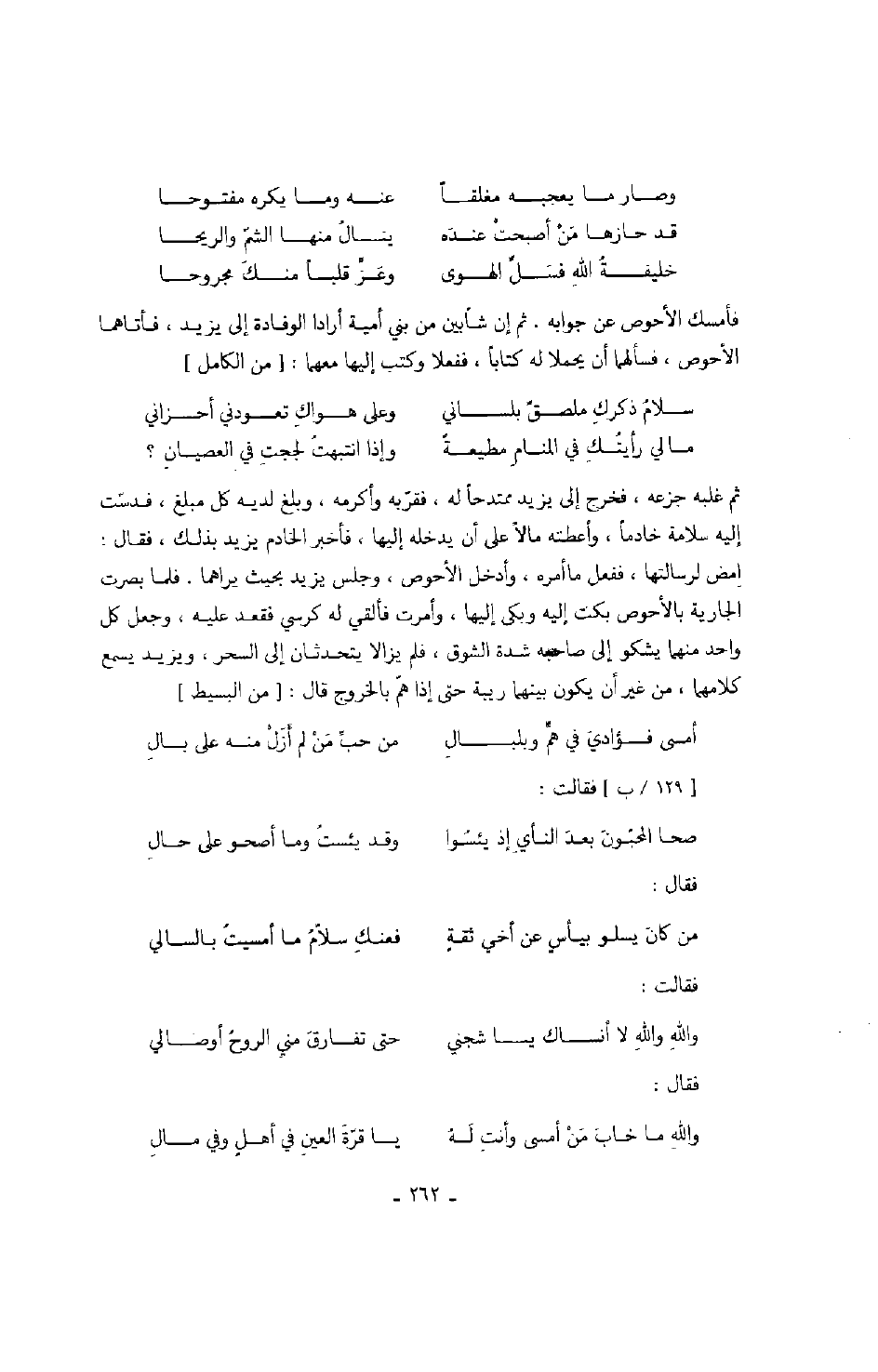 فأمسك الأحوص عن جوابه. ثم إن شابين من بني أمية أرادا الوفادة إلى يزيد، فأتاهما الأحوص، فسألهما أن يحملا له كتاباً، ففعلا وكتب إليها معهما: من الكامل