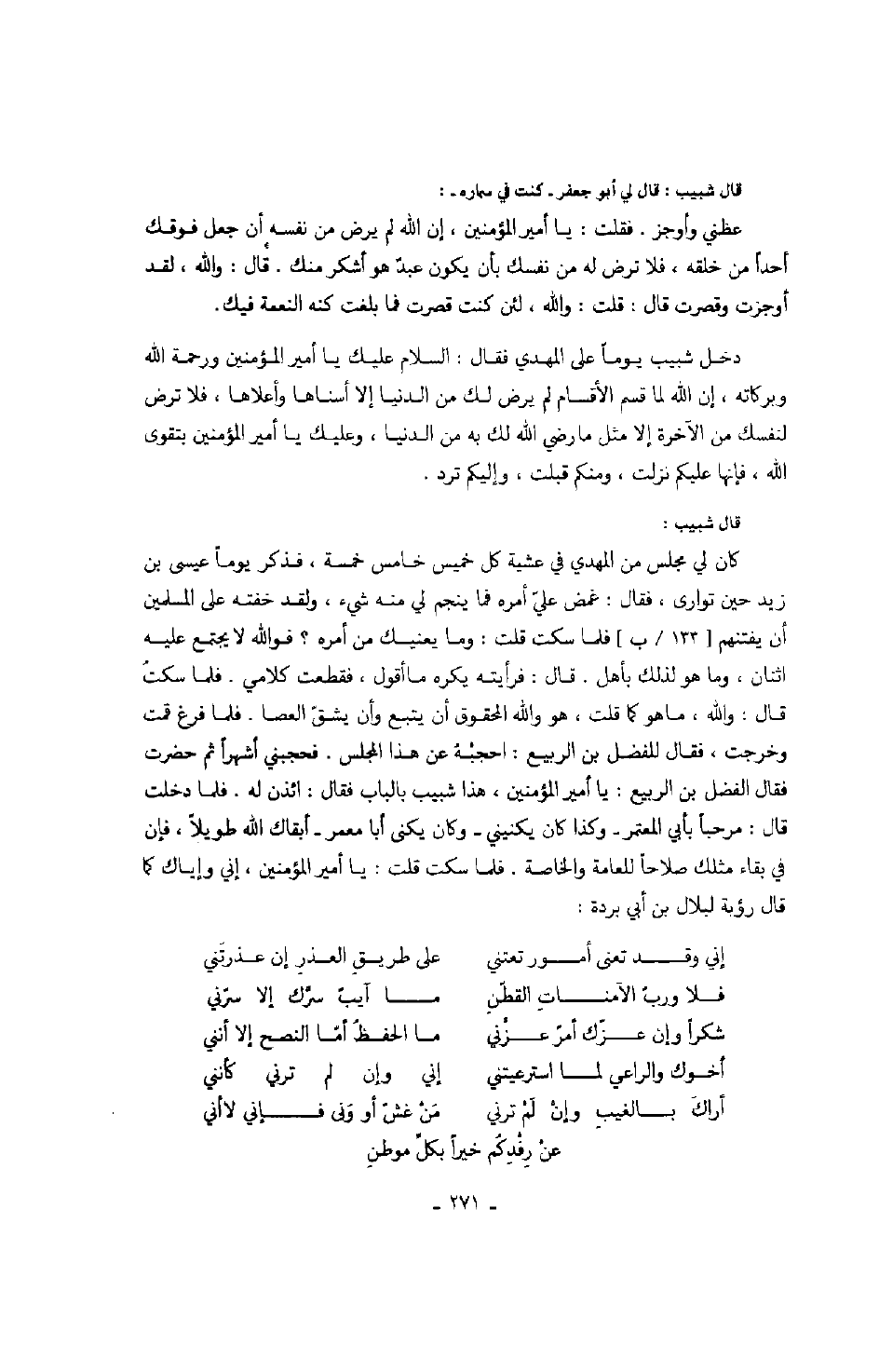 قال شبيب: قال لي أبو جعفر " كنت في سماره -: عظني وأوجز. فقلت: يا أمير المؤمنين، إن الله لم يرض من نفسه أن جعل فوقك أحداً من خلقه، فلا ترض له من نفسك بأن يكون عبد هو أشكر منك. قال: والله، لقد أوجزت وقصرت قال: قلت: والله، لئن كنت قصرت فما بلغت كنه النعمة فيك.